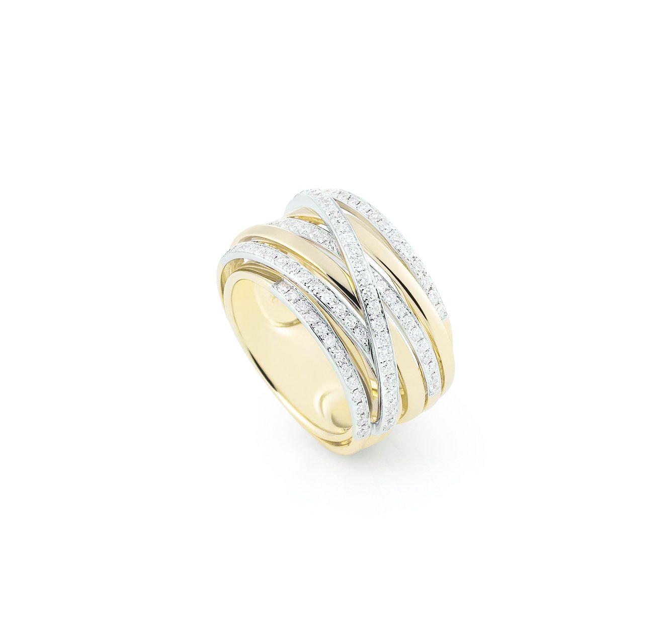 Deze ring is gemaakt van 18 karaats wit- en geelgoud. Deze ring heeft 83 briljant geslepen diamanten met een totaalgewicht van 0.94crt kleur/zuiverheid W/SI. De ring heeft maat 53. Zit uw maat er niet bij? Als officieel dealer van Al Coro kunnen wij alles voor u bestellen. Voor meer informatie over Al Coro gaat u naar www.alcoro.com