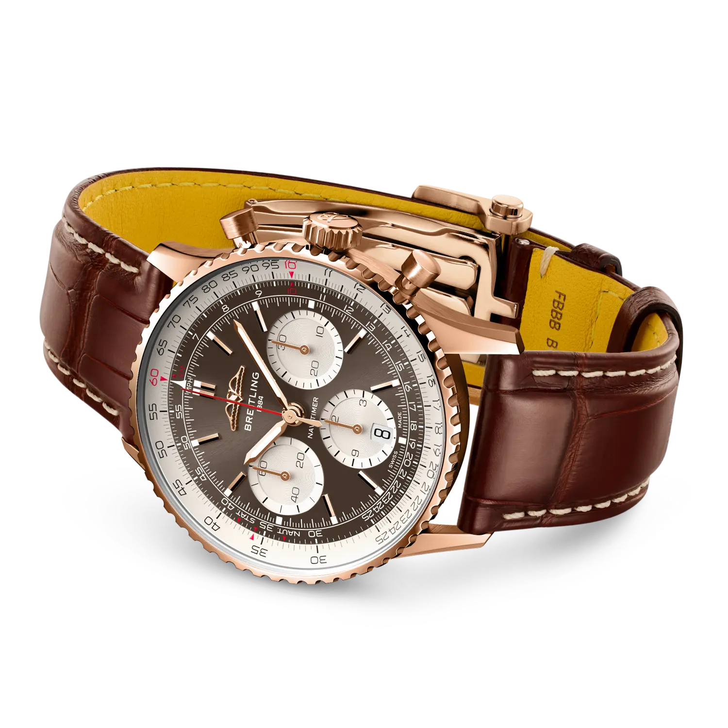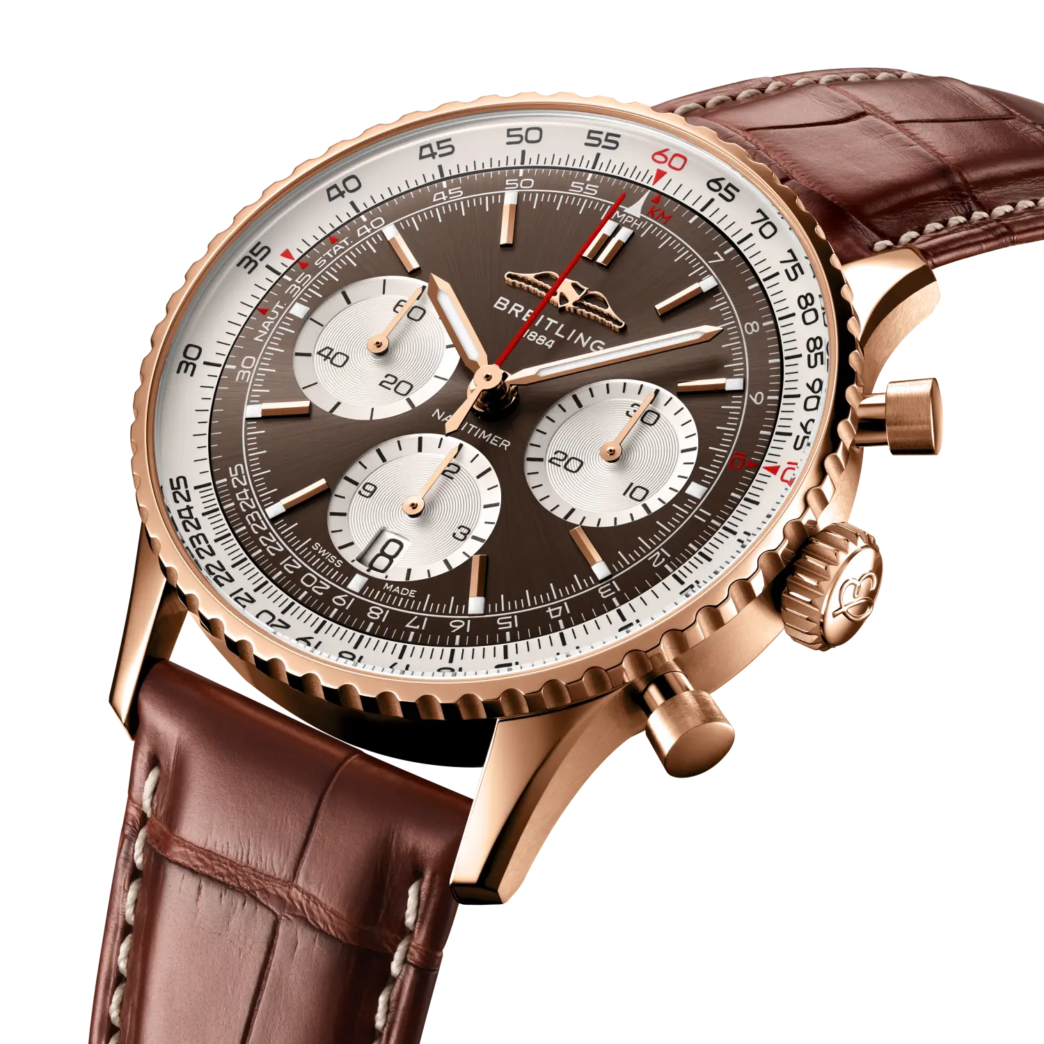 Dit horloge heeft een bruine analoge wijzerplaat met een 18 karaat roodgouden kast (41 mm diameter) en is voorzien van saffier glas. Het horloge is voorzien van een automatisch uurwerk en is 3 ATM/Bar (30m) waterdicht. Dit horloge komt uit de Navitimer serie. Het horloge heeft de volgende extra functies: datum, chronograaf en tachymeter. Dit horloge heeft 5 jaar garantie. Voor meer informatie over Breitling gaat u naar www.breitling.com.