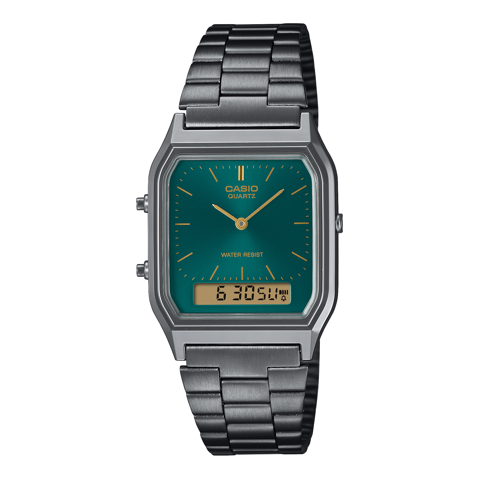 Dit horloge heeft een groene digitale en analoge wijzerplaat met een grijze kast (38,80mm x 29,80mm) en is voorzien van acryl glas. Het horloge is voorzien van een quartz uurwerk en is 3 ATM/Bar (30 m) waterdicht. Dit horloge komt uit de Casio Vintage serie. Het horloge heeft de volgende extra functies: Tweede tijdzone, Stopwatchfunctie, Dagalarm, Automatische kalender, 12/24-uurs tijdweergave. Voor meer informatie over Casio gaat u naar www.casio-europe.com.