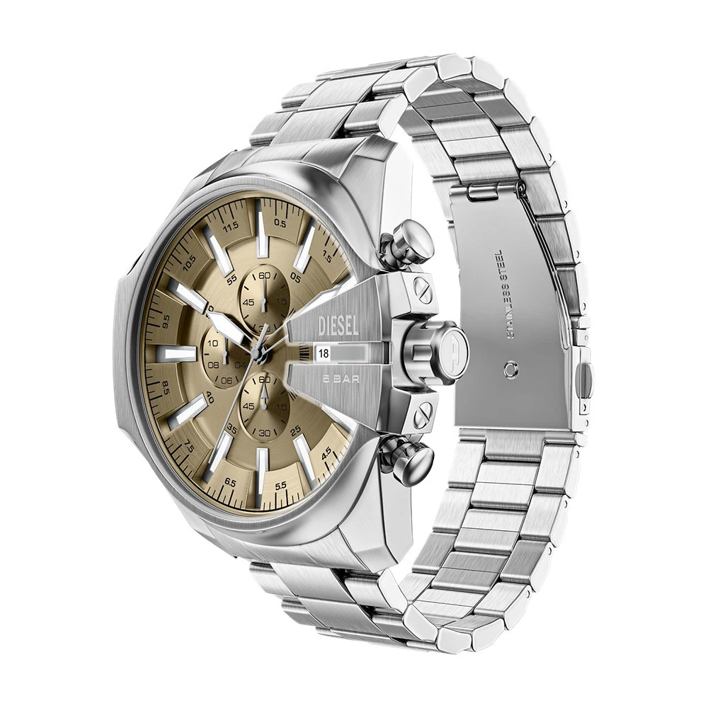 Dit horloge heeft een geelgoudkleurige analoge wijzerplaat met een zilverkleurige kast (48 mm diameter) en is voorzien van mineraal glas. Het horloge is voorzien van een quartz (batterij) uurwerk en is 5 ATM/Bar (50m) waterdicht. Dit horloge komt uit de Mega Chief Slim serie. Het horloge heeft de volgende extra functies: chronograaf en datum. Voor meer informatie over Diesel gaat u naar www.diesel.com.