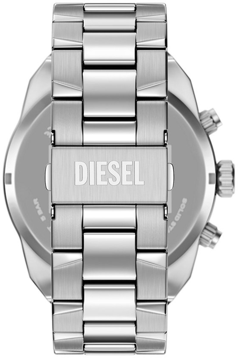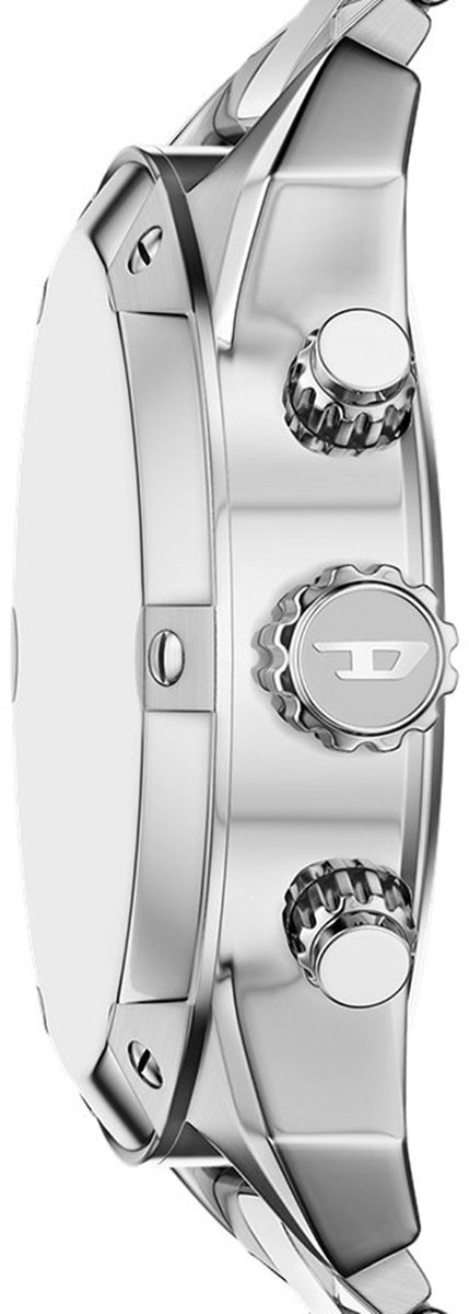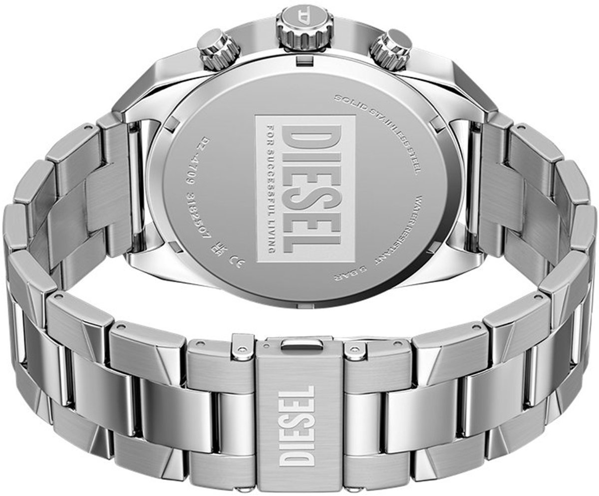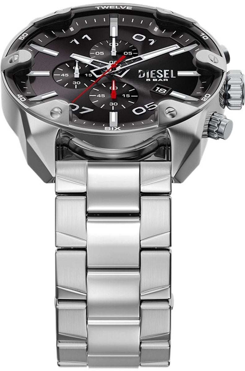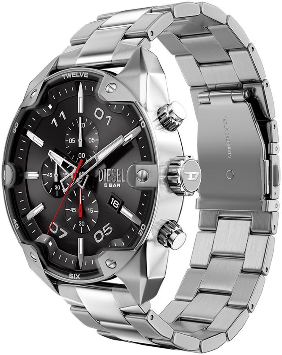 Dit horloge heeft een zwarte analoge wijzerplaat met een zilverkleurige kast (49 mm diameter) en is voorzien van mineraalglas. Het horloge is voorzien van een quartz (batterij) uurwerk en is 5 ATM/Bar (50m) waterdicht. Dit horloge komt uit de Spiked serie. Het horloge heeft de volgende extra functies: chronograaf, datum. Voor meer informatie over Diesel gaat u naar www.diesel.com.