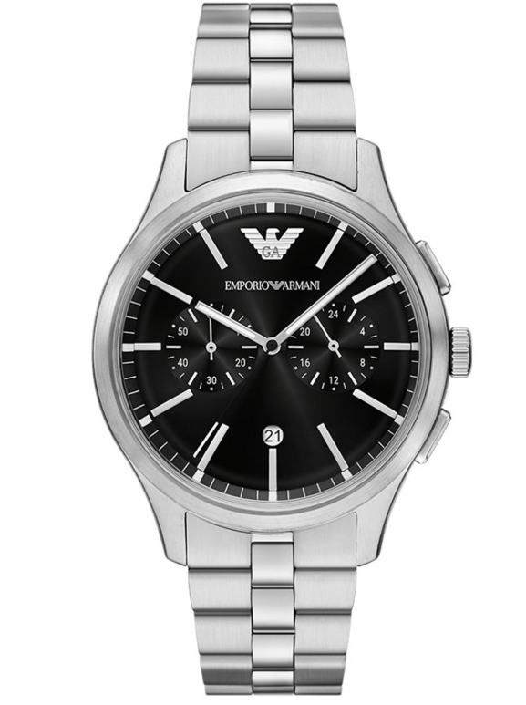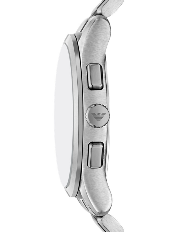 Dit horloge heeft een zwarte analoge wijzerplaat met een zilverkleurige kast (42 mm diameter) en is voorzien van mineraal glas. Het horloge is voorzien van een quartz (batterij) uurwerk en is 5 ATM/Bar (50m) waterdicht. Het horloge heeft de volgende extra functies: datum, chronograaf. Voor meer informatie over Emporio Armani gaat u naar www.armani.com.