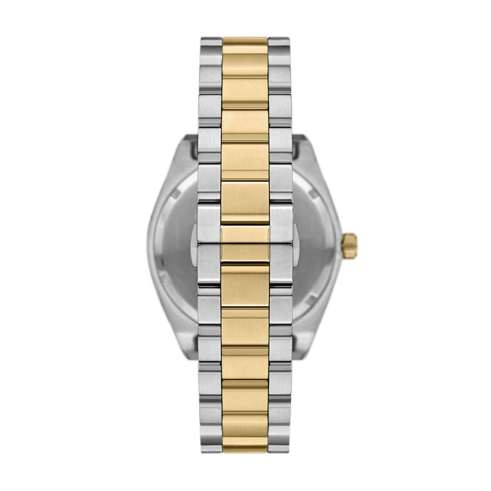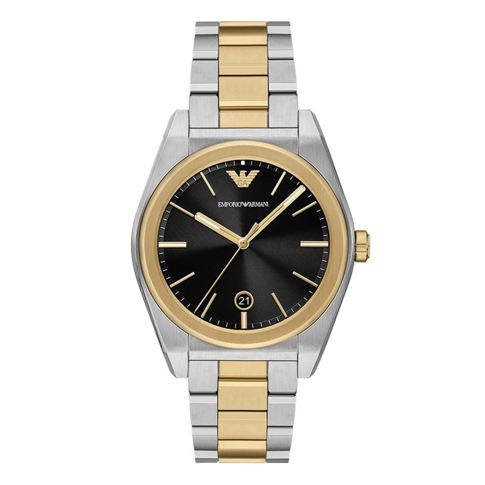 Dit horloge heeft een zwarte analoge wijzerplaat met een bicolor kast (41 mm diameter) en is voorzien van mineraal glas. Het horloge is voorzien van een quartz (batterij) uurwerk en is 5 ATM/Bar (50m) waterdicht. Het horloge heeft de volgende extra functies: datum. Voor meer informatie over Emporio Armani gaat u naar www.armani.com.