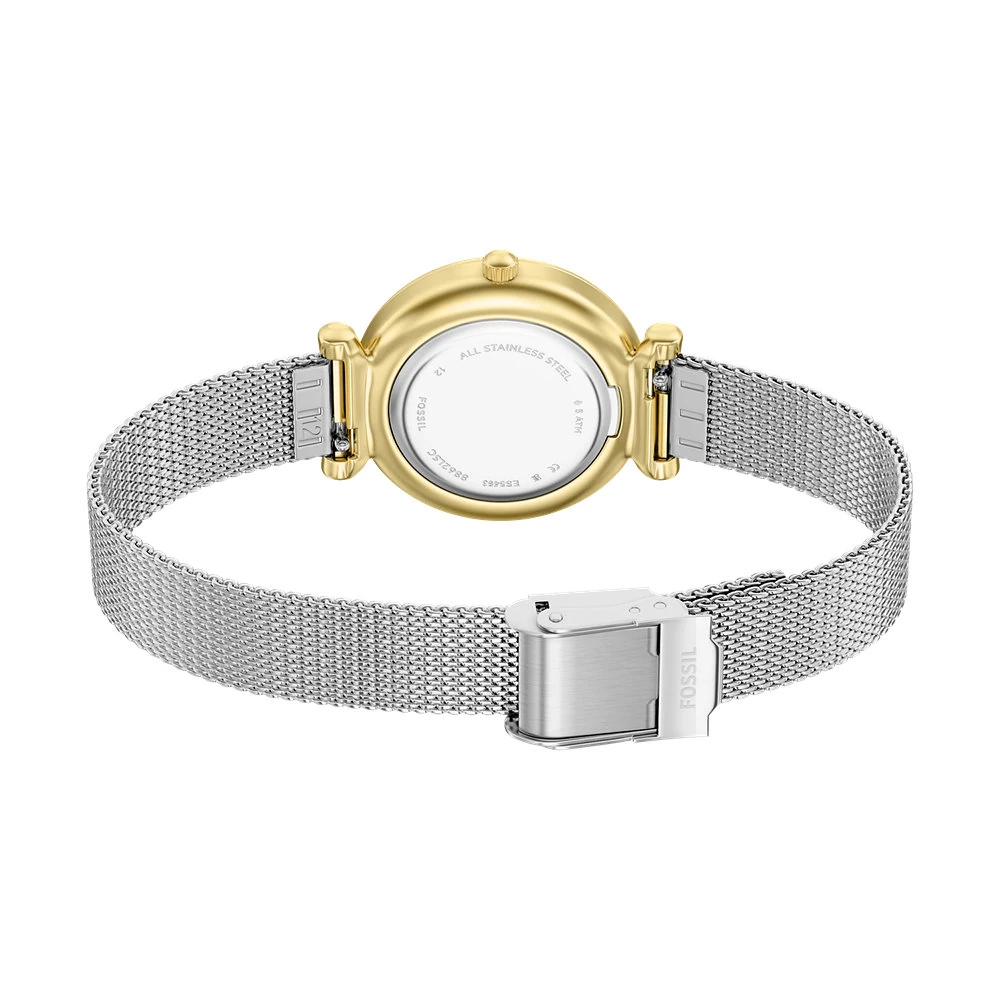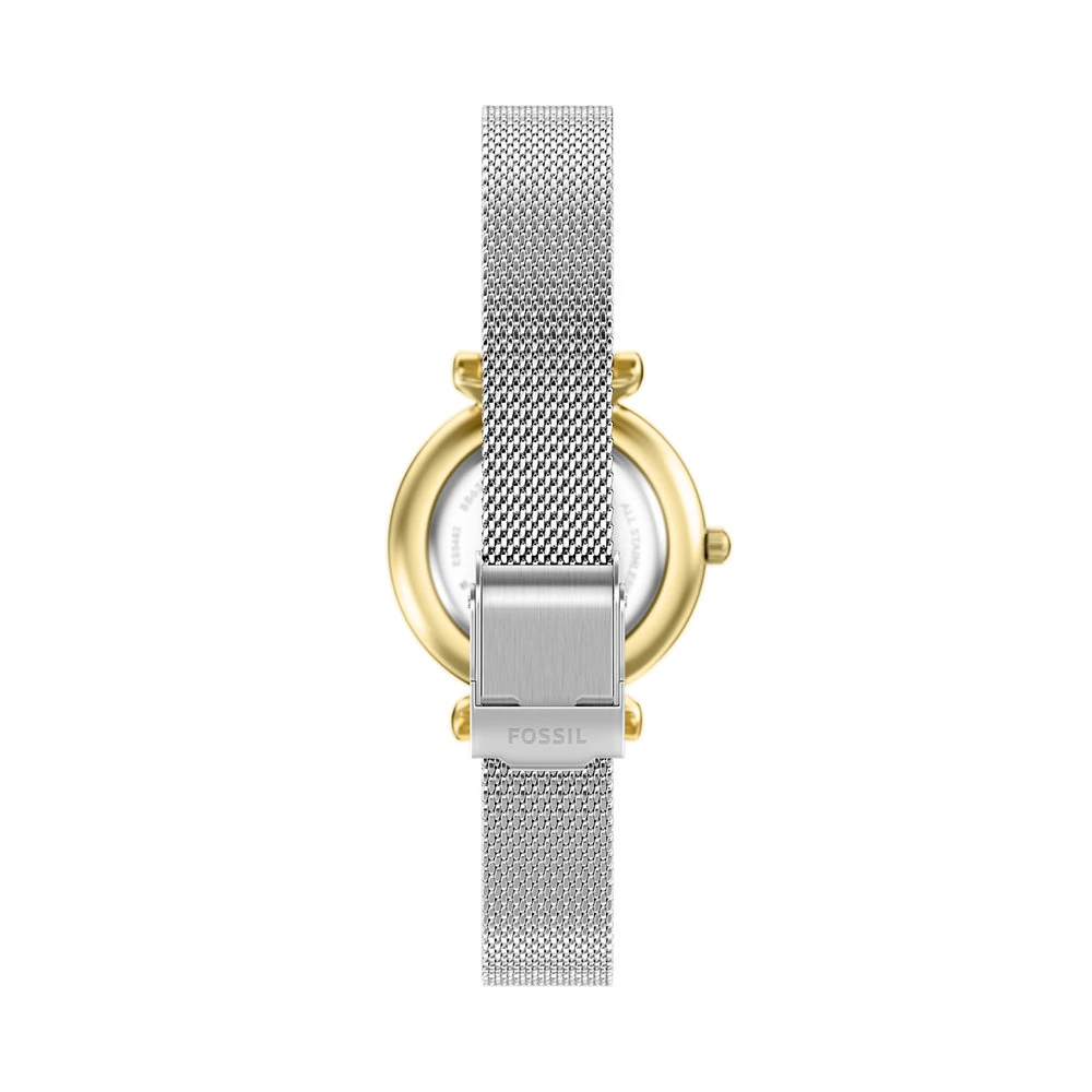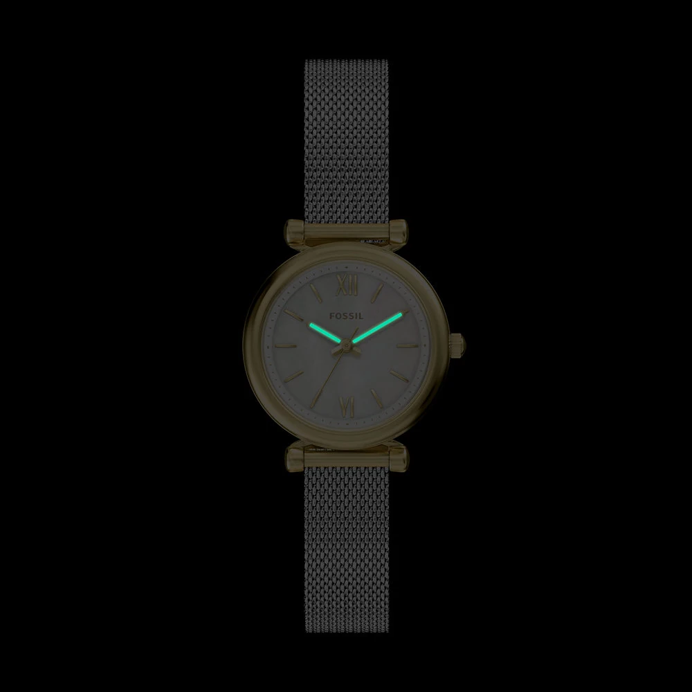 Dit horloge heeft een parelmoer witte wijzerplaat met een geelgoudkleurige kast (28 mm diameter) en is voorzien van mineraal glas. Het horloge is voorzien van een quartz (batterij) uurwerk en is 5 ATM/Bar (50m) waterdicht. Dit horloge komt uit de Carlie serie. Het horloge heeft geen extra functies. Voor meer informatie over Fossil gaat u naar www.fossil.com.