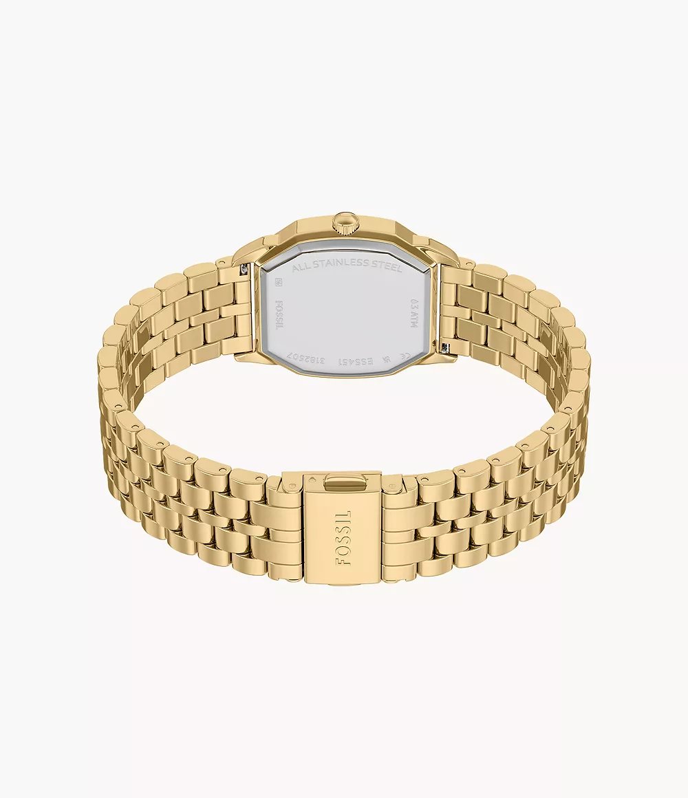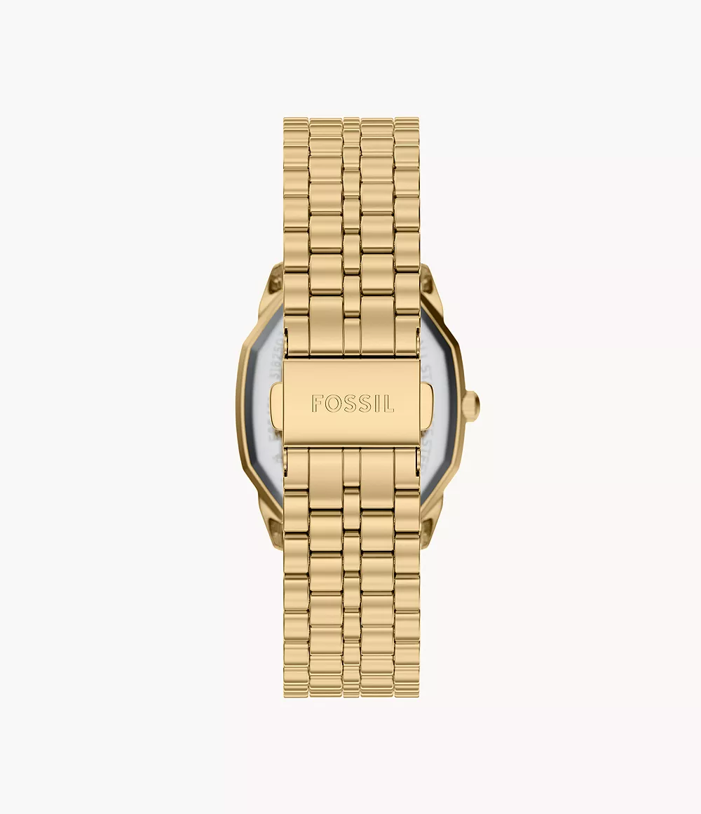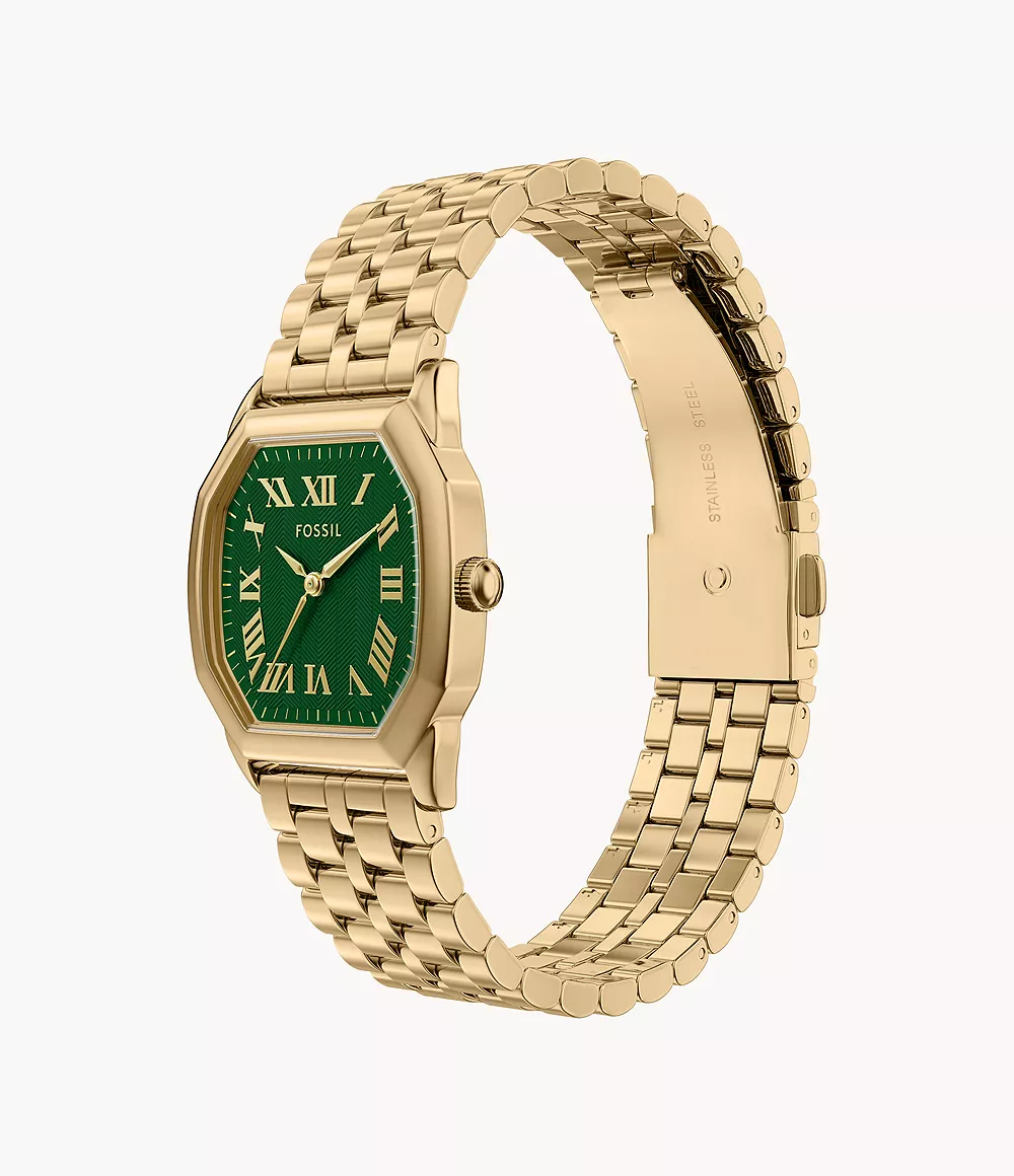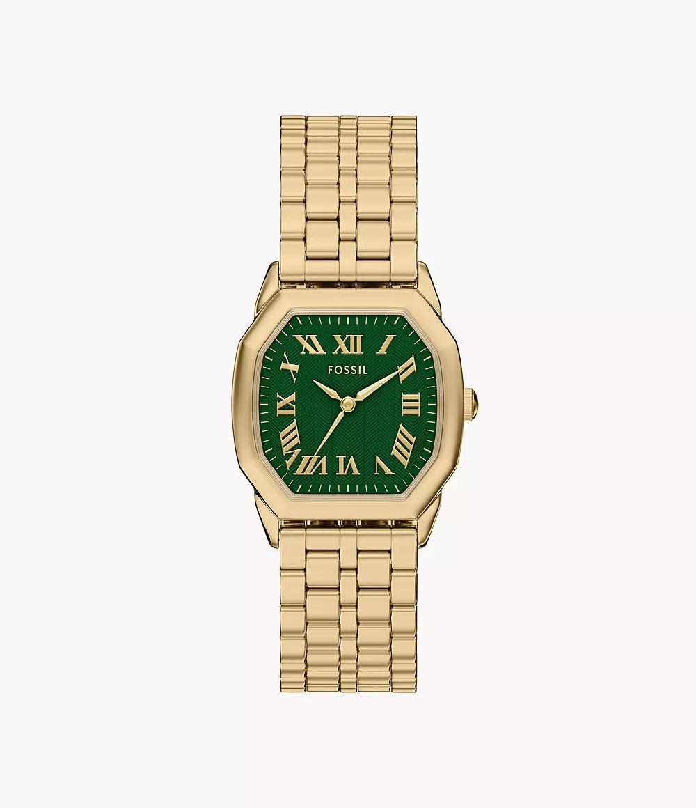 Dit horloge heeft een groene analoge wijzerplaat met een geelgoudkleurige kast (27 mm diameter) en is voorzien van mineraal glas. Het horloge is voorzien van een quartz (batterij) uurwerk en is 3 ATM/Bar (30m) waterdicht. Dit horloge komt uit de Harlow serie. Voor meer informatie over Fossil gaat u naar www.fossil.com.