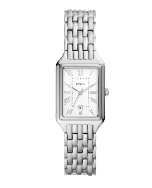 Dit horloge heeft een zilverkleurige analoge wijzerplaat met een zilverkleurige kast (23 mm diameter) en is voorzien van mineraal glas. Het horloge is voorzien van een quartz (batterij) uurwerk en is 5 ATM/Bar (50m) waterdicht. Dit horloge komt uit de Raquel serie. Het horloge heeft de volgende extra functies: datum. Voor meer informatie over Fossil gaat u naar www.fossil.com.