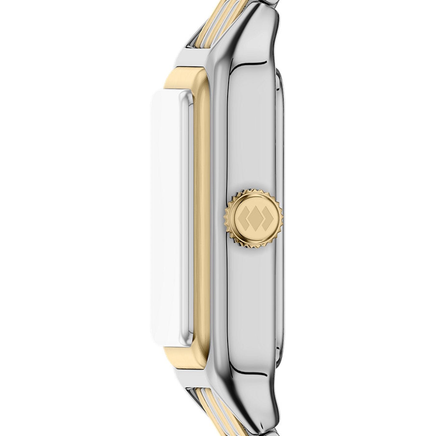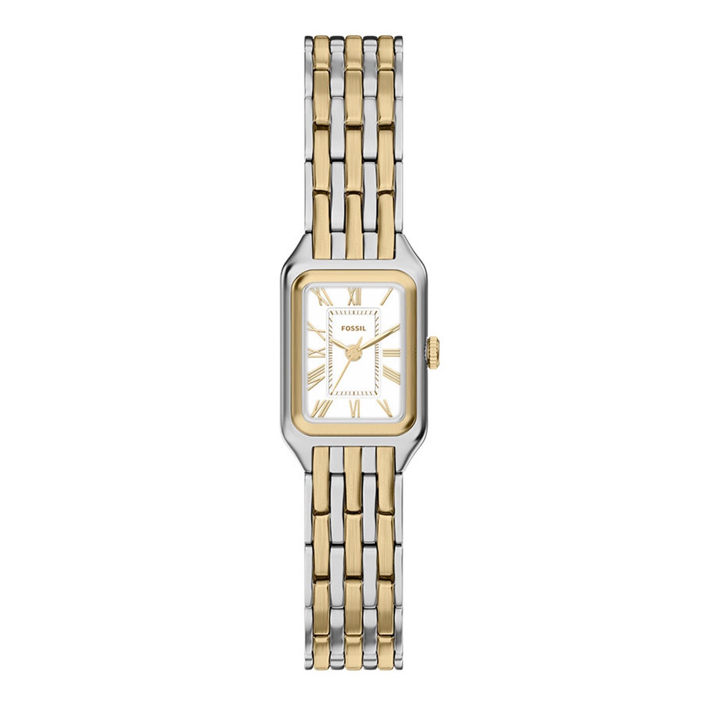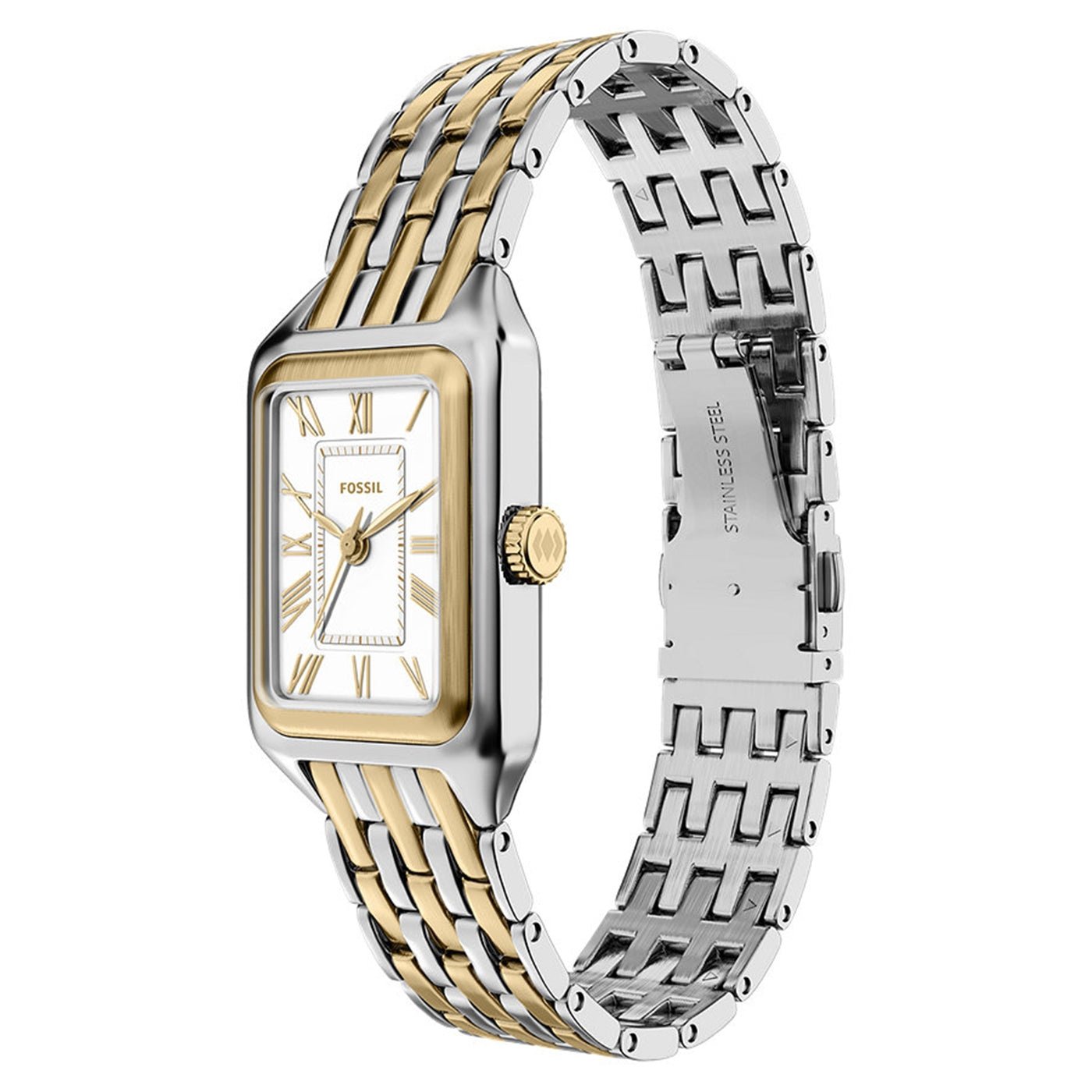 Dit horloge heeft een witte analoge wijzerplaat met een bicolor kast (18 mm diameter) en is voorzien van mineraal glas. Het horloge is voorzien van een quartz (batterij) uurwerk en is 5 ATM/Bar (50m) waterdicht. Dit horloge komt uit de Raquel serie. Het horloge heeft geen extra functies. Voor meer informatie over Fossil gaat u naar www.fossil.com.