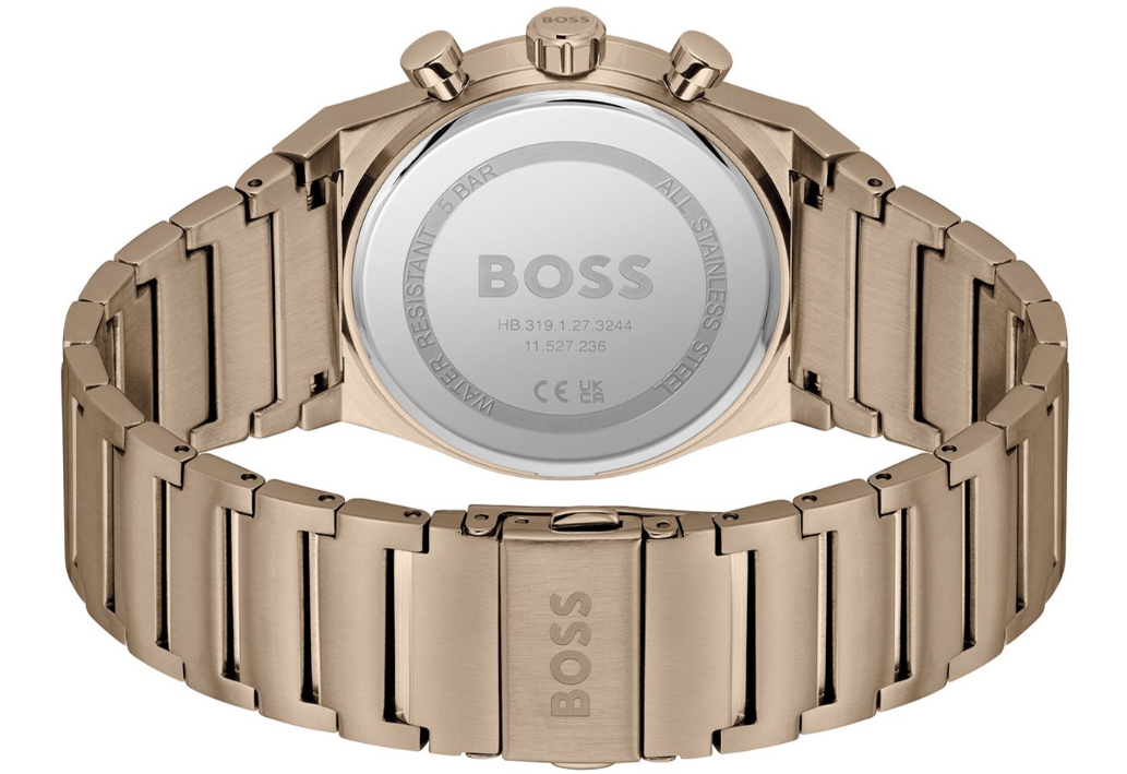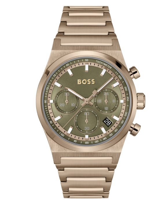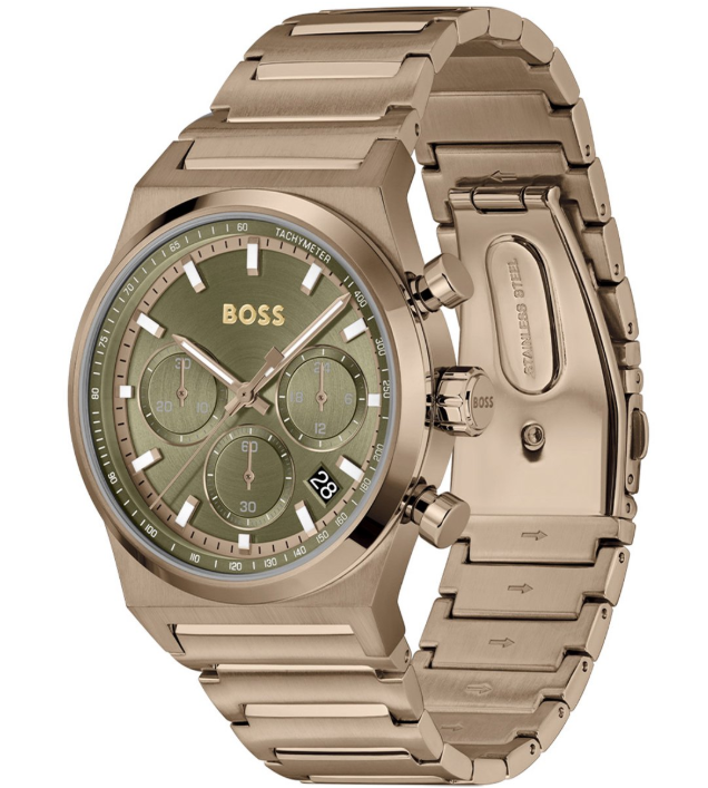 Dit horloge heeft een groene analoge wijzerplaat met een goudbronskleurige kast (41 mm diameter) en is voorzien van mineraalglas. Het horloge is voorzien van een quartz uurwerk en is 5 ATM/Bar (50m) waterdicht. Dit horloge komt uit de Candor serie. Het horloge heeft de volgende extra functies: datum, chronograaf. Voor meer informatie over Hugo Boss Black gaat u naar www.hugoboss.com.