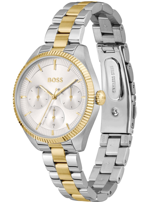Dit horloge heeft een zilverkleurige analoge wijzerplaat met een bicolor kast (34 mm diameter) en is voorzien van mineraalglas. Het horloge is voorzien van een quartz (batterij) uurwerk en is 3 ATM/Bar (30m) waterdicht. Dit horloge komt uit de Sage Sport serie. Het horloge heeft de volgende extra functies: dag-, datum- en 24-uursaanduiding. Voor meer informatie over Hugo Boss Black gaat u naar www.hugoboss.com.