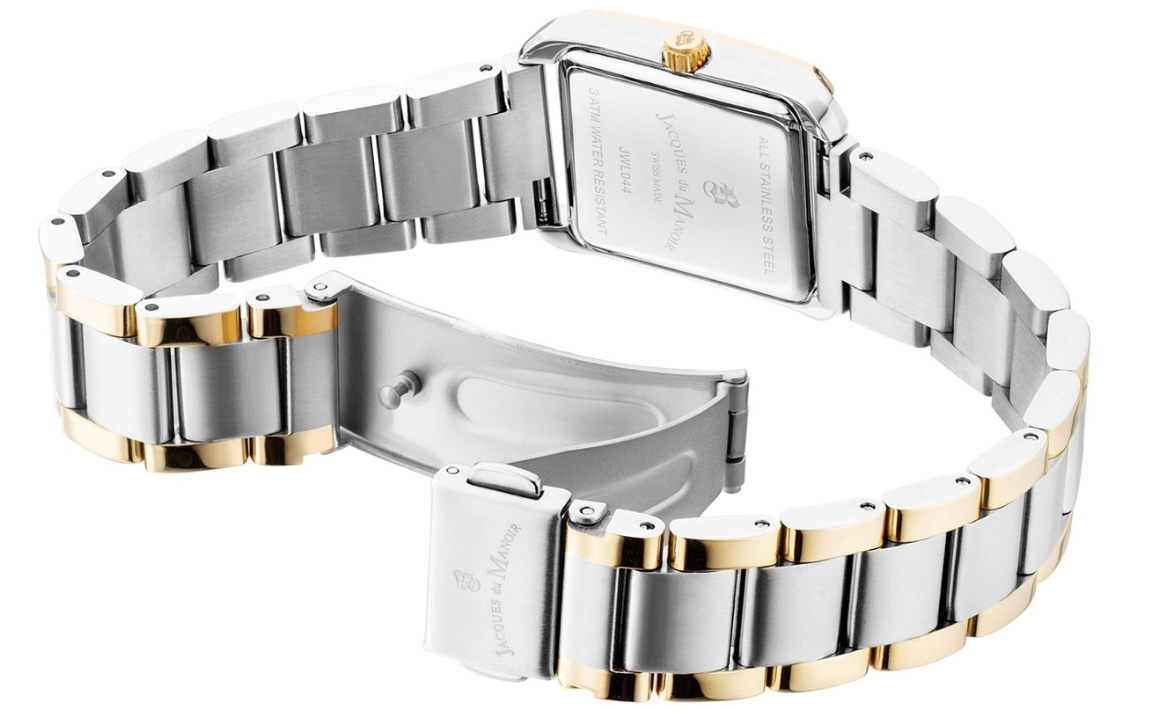 Dit horloge heeft een witte analoge wijzerplaat met een bicolor kast (22x19 mm diameter) en is voorzien van mineraalglas. Het horloge is voorzien van een quartz (batterij) uurwerk en is 5 ATM/Bar (50m) waterdicht. Dit horloge komt uit de Emily serie. Voor meer informatie over Jacques du Manoir gaat u naar www.jacquesdumanoir.ch