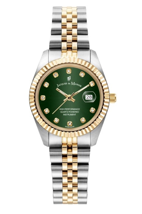 Dit horloge heeft een groene analoge wijzerplaat met een bicolor kast (31 mm diameter) en is voorzien van mineraalglas. Het horloge heeft de volgende extra functies: datum. Het horloge is voorzien van een quartz (batterij) uurwerk en is 5 ATM/Bar (50m) waterdicht. Dit horloge komt uit de Inspiration serie. Voor meer informatie over Jacques du Manoir gaat u naar www.jacquesdumanoir.ch
