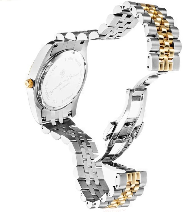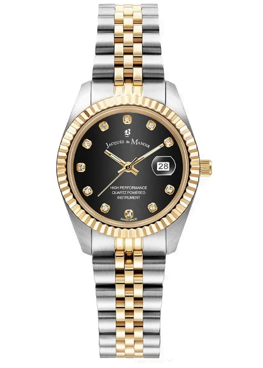 Dit horloge heeft een zwarte analoge wijzerplaat met een bicolor kast (31 mm diameter) en is voorzien van mineraalglas. Het horloge is voorzien van een quartz (batterij) uurwerk en is 5 ATM/Bar (50m) waterdicht. Het horloge heeft de volgende extra functies: datum. Dit horloge komt uit de Inspiration serie. Voor meer informatie over Jacques du Manoir gaat u naar www.jacquesdumanoir.ch