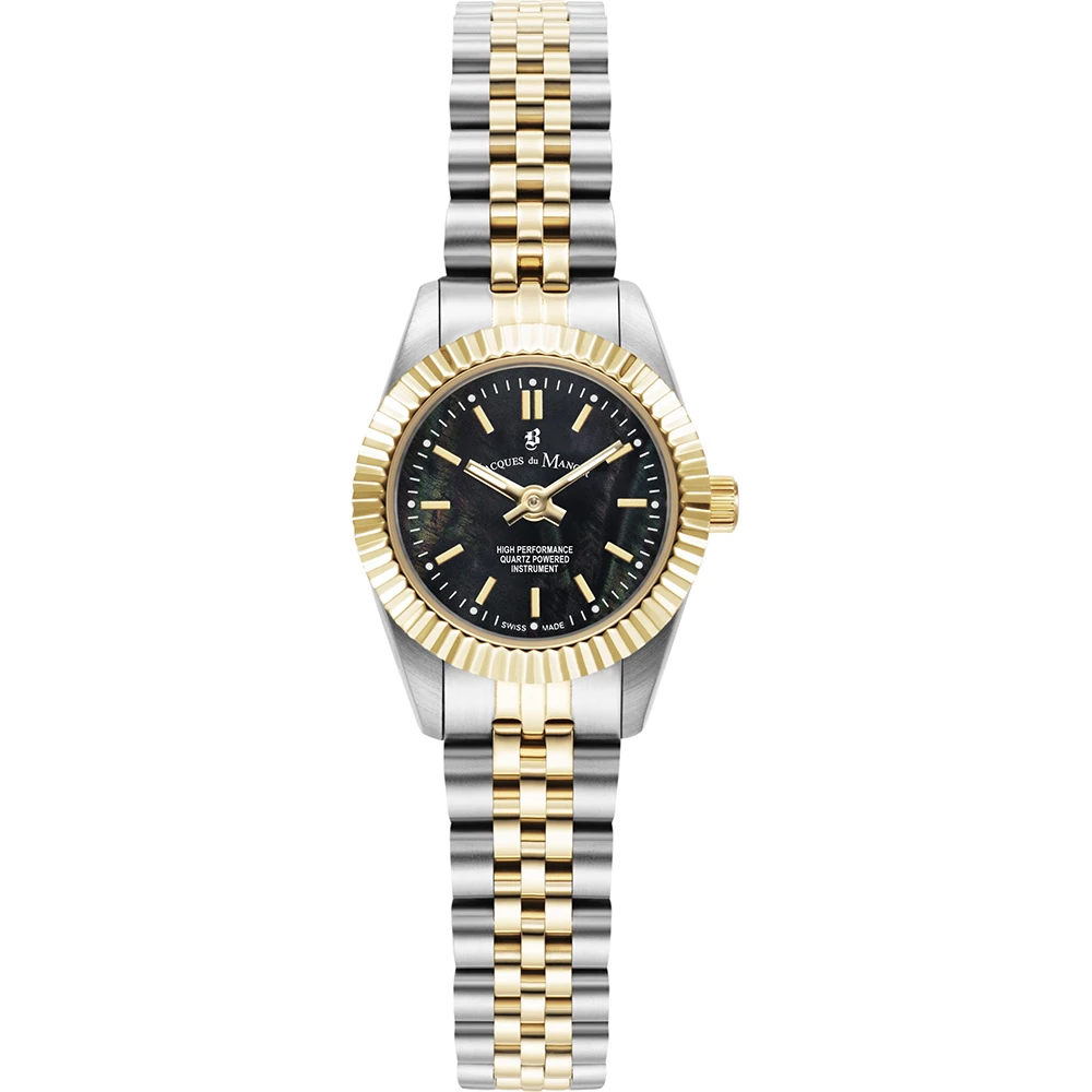 Dit horloge heeft een zwarte analoge wijzerplaat met een bicolor kast (22 mm diameter) en is voorzien van mineraalglas. Het horloge is voorzien van een quartz (batterij) uurwerk en is 5 ATM/Bar (50m) waterdicht. Dit horloge komt uit de Inspiration serie. Voor meer informatie over Jacques du Manoir gaat u naar www.jacquesdumanoir.ch