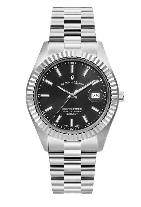 Dit horloge heeft een zwarte analoge wijzerplaat met een zilverkleurige kast (40 mm diameter) en is voorzien van mineraalglas. Het horloge is voorzien van een quartz (batterij) uurwerk en is 5 ATM/Bar (50m) waterdicht. Dit horloge komt uit de Inspiration serie. Dit horloge heeft de volgende extra functies: datum. Voor meer informatie over Jacques du Manoir gaat u naar www.jacquesdumanoir.ch