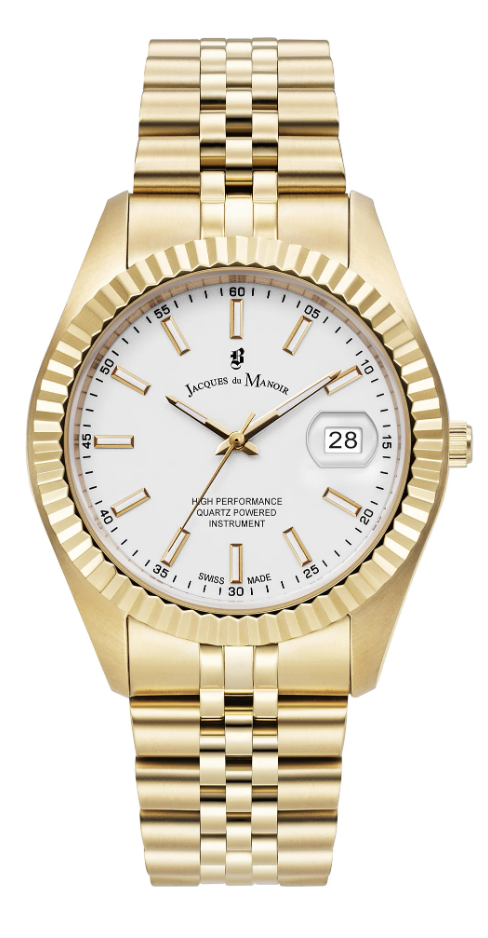 Dit horloge heeft een witte analoge wijzerplaat met een geelgoudkleurige kast (40 mm diameter) en is voorzien van mineraalglas. Het horloge is voorzien van een quartz (batterij) uurwerk en is 5 ATM/Bar (50m) waterdicht. Dit horloge komt uit de Inspiration serie. Dit horloge heeft de volgende extra functies: datum. Voor meer informatie over Jacques du Manoir gaat u naar www.jacquesdumanoir.ch