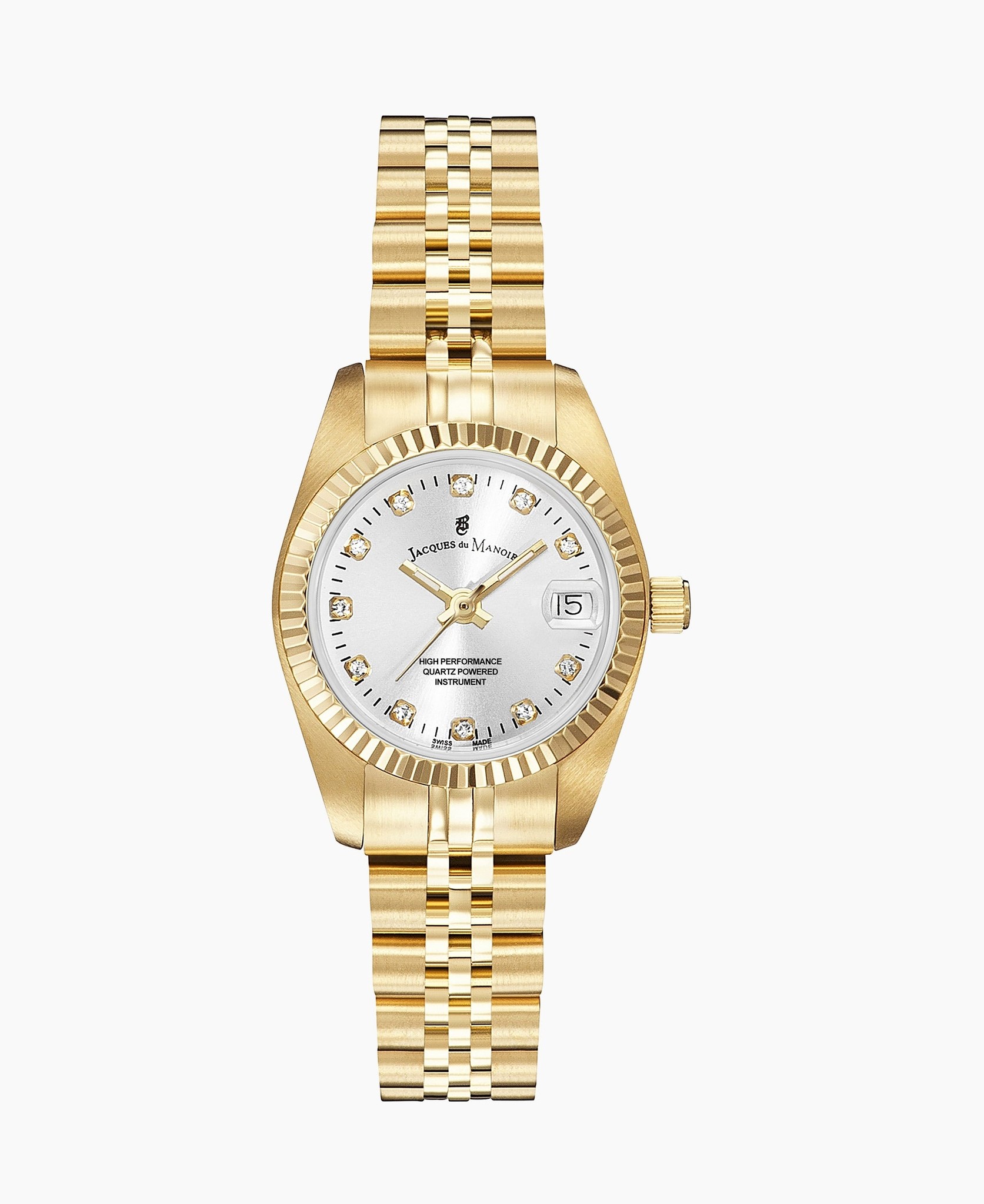 Dit horloge heeft een zilverkleurige analoge wijzerplaat met een geelgoudkleurige kast (26 mm diameter) en is voorzien van mineraal glas. Het horloge is voorzien van een quartz (batterij) uurwerk en is 5 ATM/Bar (50m) waterdicht. Dit horloge komt uit de Inspiration serie. Het horloge heeft de volgende extra functies: dag- en datumaanduiding. Voor meer informatie over Jacques du Manoir gaat u naar www.jacquesdumanoir.ch