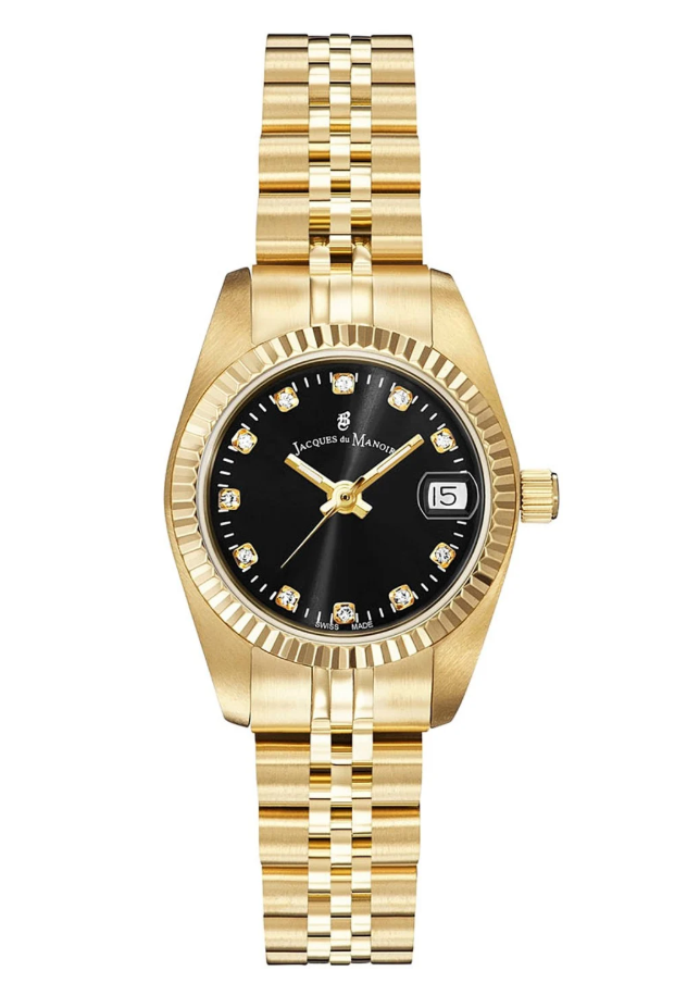 Dit horloge heeft een zwarte analoge wijzerplaat met een geelgoudkleurige kast (26 mm diameter) en is voorzien van mineraalglas. Het horloge is voorzien van een quartz (batterij) uurwerk en is 5 ATM/Bar (50m) waterdicht. Dit horloge komt uit de Inspiration serie. Voor meer informatie over Jacques du Manoir gaat u naar www.jacquesdumanoir.ch