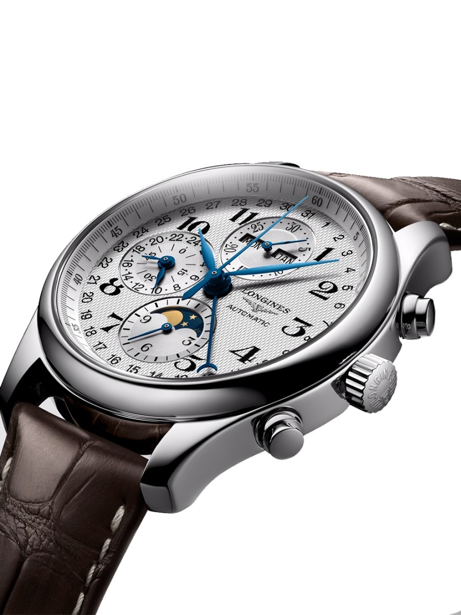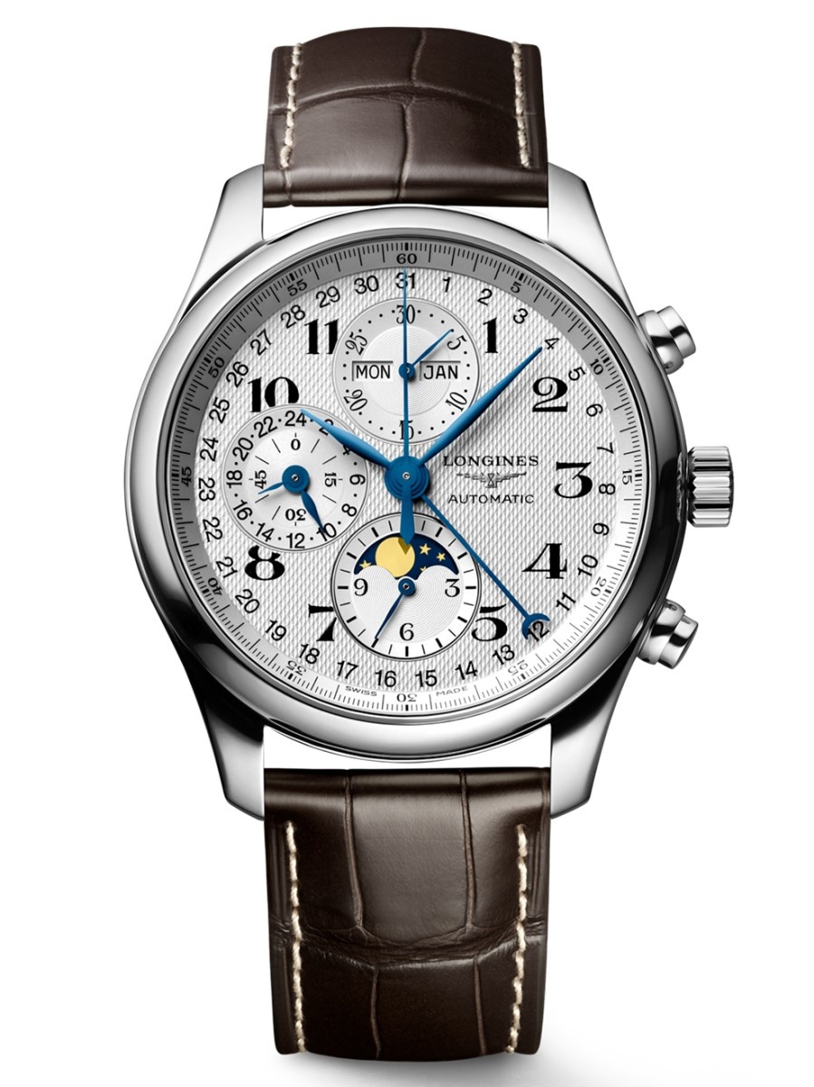 Dit horloge heeft een zilverkleurige analoge wijzerplaat met een zilverkleurige kast (43 mm diameter) en is voorzien van saffier glas. Het horloge is voorzien van een automatisch uurwerk en is 3 ATM/Bar (30m) waterdicht. Dit horloge komt uit de Master Collection serie. Het horloge heeft de volgende extra functies: chronograaf, dag/maand- en datumaanduiding en maanfase. Voor meer informatie over Longines gaat u naar www.longines.com.