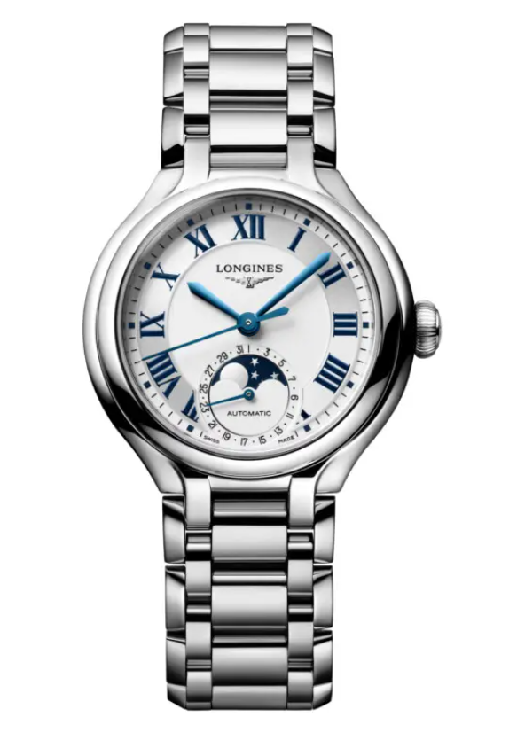 Dit horloge heeft een zilverkleurige analoge wijzerplaat met een zilverkleurige kast (34 mm diameter) en is voorzien van saffier glas. Het horloge is voorzien van een automatisch uurwerk en is 3 ATM/Bar (30m) waterdicht. Dit horloge komt uit de Primaluna serie. Het horloge heeft de volgende extra functies: datum, maanfase. Voor meer informatie over Longines gaat u naar www.longines.com.