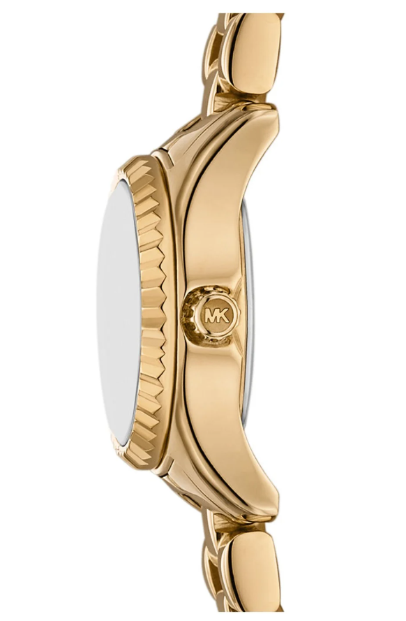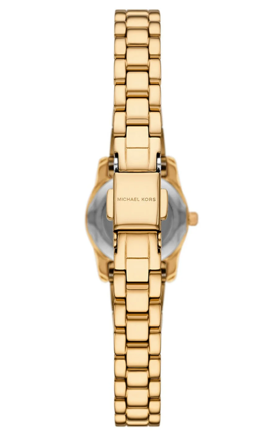 Dit horloge heeft een goudkleurige analoge wijzerplaat met een geelgoudkleurige kast (28 mm diameter) en is voorzien van mineraal glas. Het horloge is voorzien van een quartz (batterij) uurwerk en is 5 ATM/Bar (50m) waterdicht. Dit horloge komt uit de Lexington serie. Het horloge heeft geen extra functies . Voor meer informatie over Michael Kors gaat u naar www.michaelkors.com.