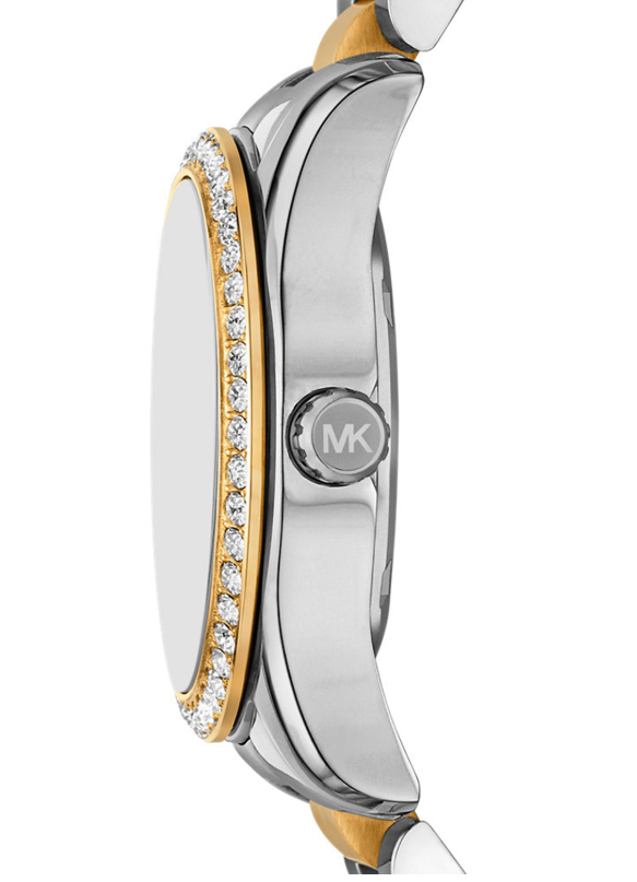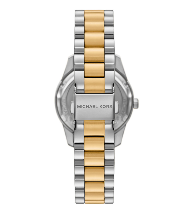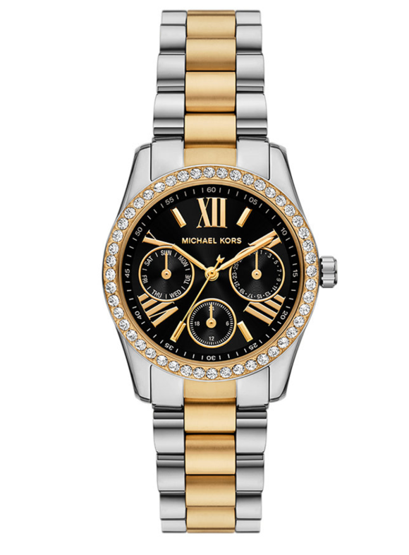 Dit horloge heeft een zwarte analoge wijzerplaat met een bicolor kast (33 mm diameter) en is voorzien van mineraal glas. Het horloge is voorzien van een quartz (batterij) uurwerk en is 10 ATM/Bar (100m) waterdicht. Dit horloge komt uit de Lexington serie. Het horloge heeft de volgende extra functies: stopwatch en datumaanduiding . Voor meer informatie over Michael Kors gaat u naar www.michaelkors.com.