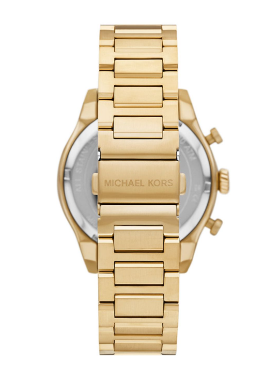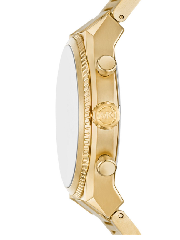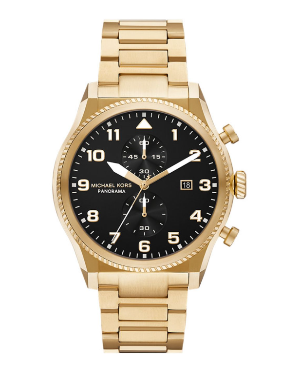 Dit horloge heeft een zwarte analoge wijzerplaat met een geelgoudkleurige kast (44 mm diameter) en is voorzien van mineraal glas. Het horloge is voorzien van een quartz (batterij) uurwerk en is 10 ATM/Bar (100m) waterdicht. Dit horloge komt uit de Panorama serie. Het horloge heeft de volgende extra functies: chronograaf, datum. Voor meer informatie over Michael Kors gaat u naar www.michaelkors.com.