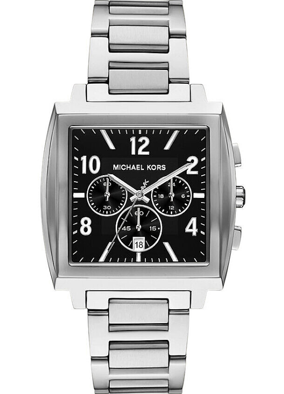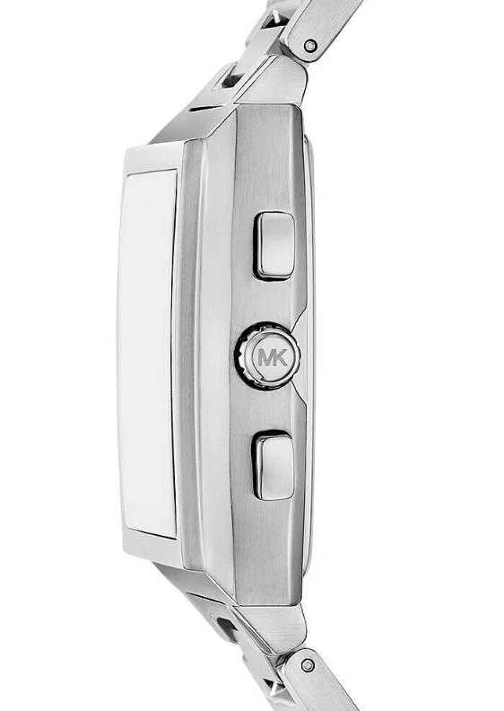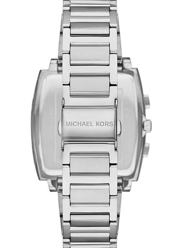 Dit horloge heeft een zwarte analoge wijzerplaat met een zilverkleurige kast (41 mm diameter) en is voorzien van mineraal glas. Het horloge is voorzien van een quartz (batterij) uurwerk en is 5 ATM/Bar (50m) waterdicht. Dit horloge komt uit de Rhys serie. Het horloge heeft de volgende extra functies: datum, chronograaf. Voor meer informatie over Michael Kors gaat u naar www.michaelkors.com.