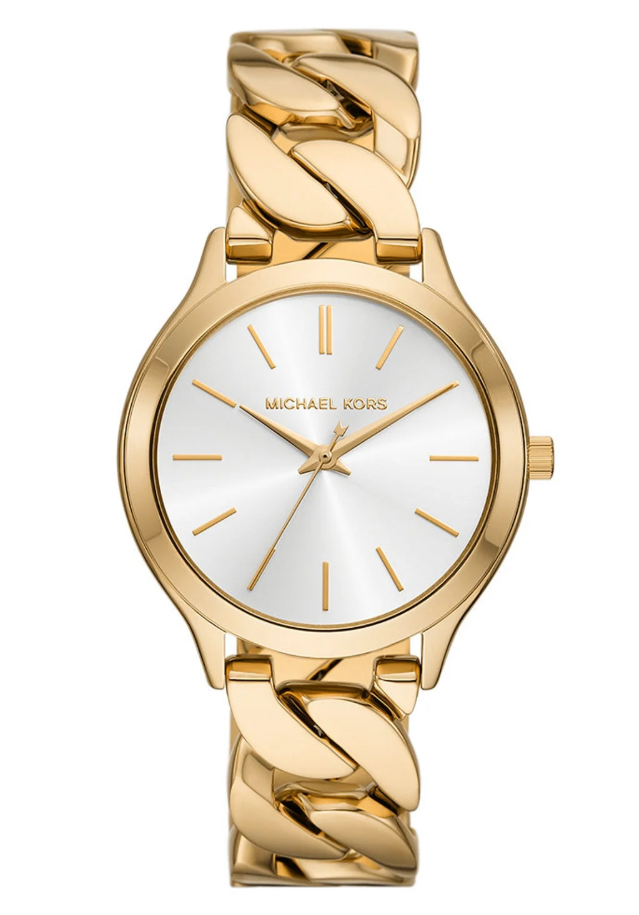 Dit horloge heeft een zilverkleurige analoge wijzerplaat met een geelgoudkleurige kast (38 mm diameter) en is voorzien van mineraal glas. Het horloge is voorzien van een quartz (batterij) uurwerk en is 5 ATM/Bar (50m) waterdicht. Dit horloge komt uit de Runway serie. Het horloge heeft de volgende extra functies: geen. Voor meer informatie over Michael Kors gaat u naar www.michaelkors.com.