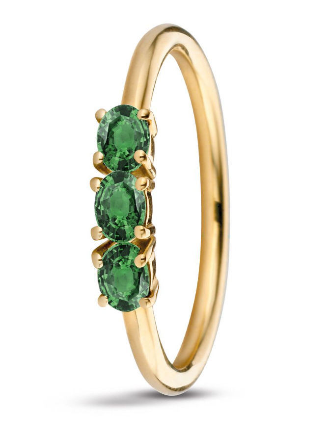 Deze ring is gemaakt van 14 karaat geelgoud en heeft drie groene tourmalines. Deze ring heeft maat 17,5. Zit uw maat er niet bij? of heeft u liever een andere kleur goud? Als officieel dealer van Miss Spring kunnen wij alles voor u bestellen. Voor meer informatie over Miss Spring gaat u naar www.missspring.nl.