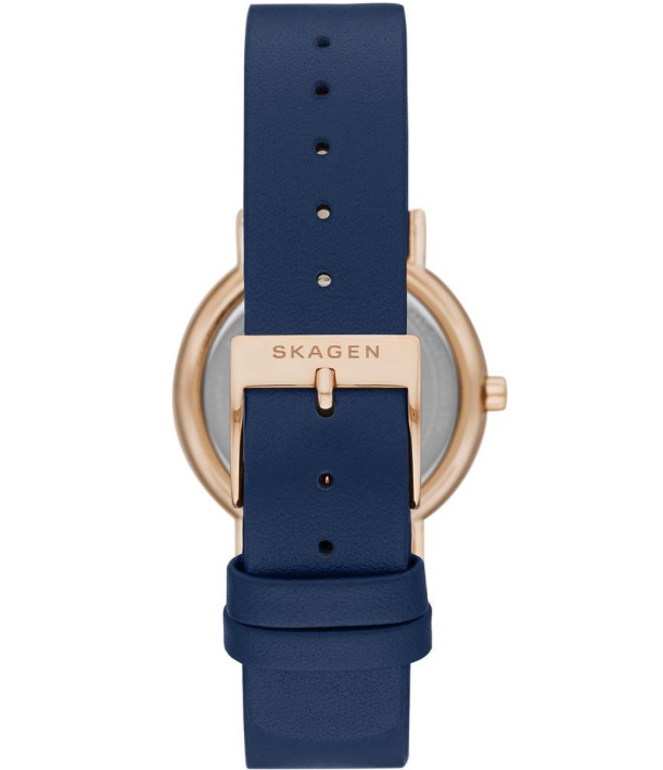 Dit horloge heeft een witte analoge wijzerplaat met een rósegoudkleurige kast (30 mm diameter) en is voorzien van mineraal glas. Het horloge is voorzien van een quartz (batterij) uurwerk en is 3 ATM/Bar (30m) waterdicht. Dit horloge komt uit de Signature serie. Het horloge heeft geen extra functies. Voor meer informatie over Skagen gaat u naar www.skagen.com.