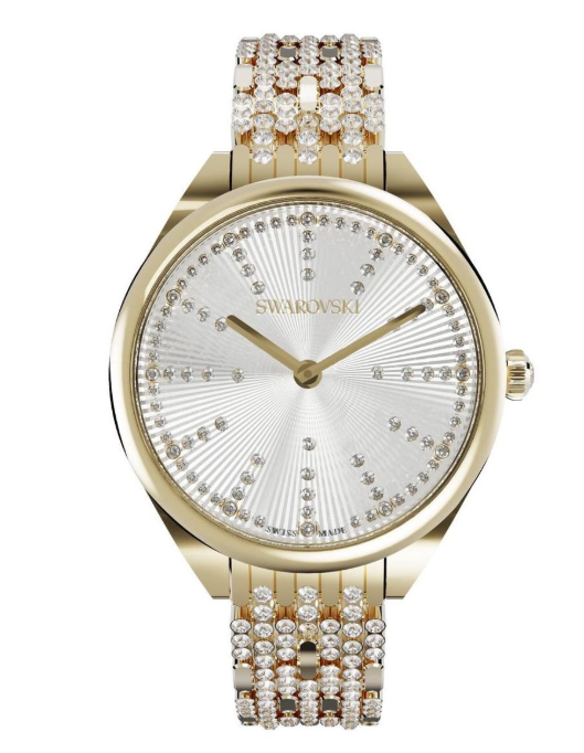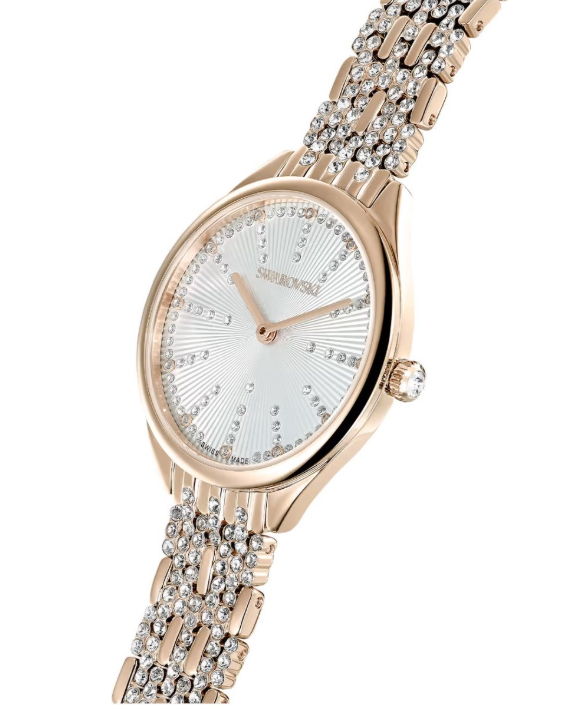 Dit horloge heeft een zilverkleurige analoge wijzerplaat met een champagnegoudkleurige kast (30 mm diameter) en is voorzien van mineraal glas. Het horloge is voorzien van een quartz uurwerk en is 3 ATM/Bar (30m) waterdicht. Dit horloge komt uit de Attract serie. Het horloge heeft geen extra functies. Voor meer informatie over Swarovski gaat u naar www.swarovski.com.