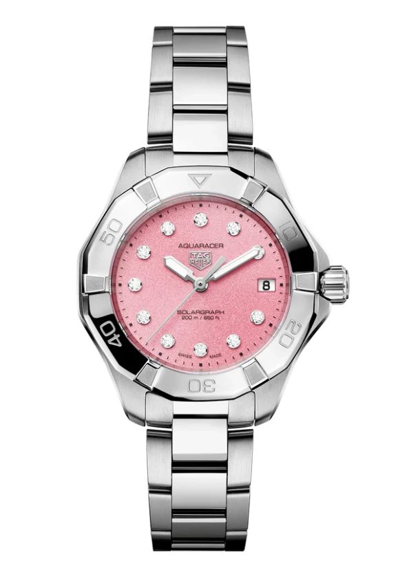 Dit horloge heeft een Roze analoge wijzerplaat met een zilverkleurige kast (34 mm diameter) en is voorzien van saffierglas. Het horloge is voorzien van een Solar quartz uurwerk en is 20 ATM/Bar (200m) duikwaterdicht. Dit horloge komt uit de aquaracer serie. Dit horloge heeft de volgende extra functies: Datum. Voor meer informatie over TAG Heuer gaat u naar www.tagheuer.com.