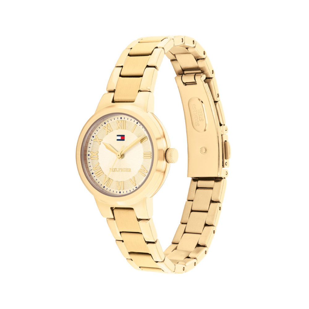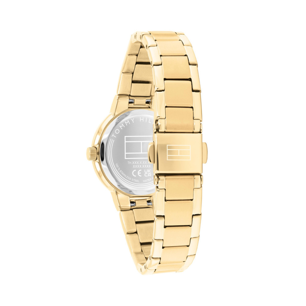 Dit horloge heeft een geelgoudkleurige analoge wijzerplaat met een geelgoudkleurige kast (28 mm diameter) en is voorzien van mineraal glas. Het horloge is voorzien van een quartz (batterij) uurwerk en is 3 ATM/Bar (30m) waterdicht. Dit horloge komt uit de Becca serie. Het horloge heeft geen extra functies. Voor meer informatie over Tommy Hilfiger gaat u naar www.tommy.com.