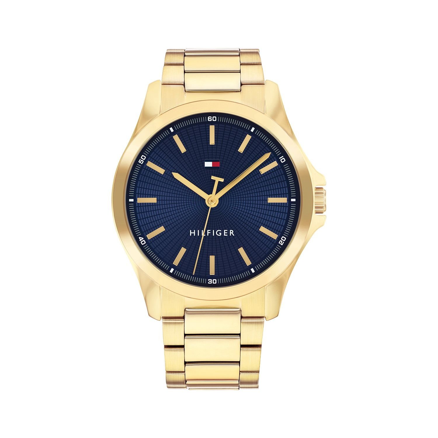 Dit horloge heeft een blauwe analoge wijzerplaat met een geelgoudkleurige kast (43 mm diameter) en is voorzien van mineraal glas. Het horloge is voorzien van een quartz (batterij) uurwerk en is 3 ATM/Bar (30m) waterdicht. Dit horloge komt uit de Bruce serie. Het horloge heeft geen extra functies. Voor meer informatie over Tommy Hilfiger gaat u naar www.tommy.com.