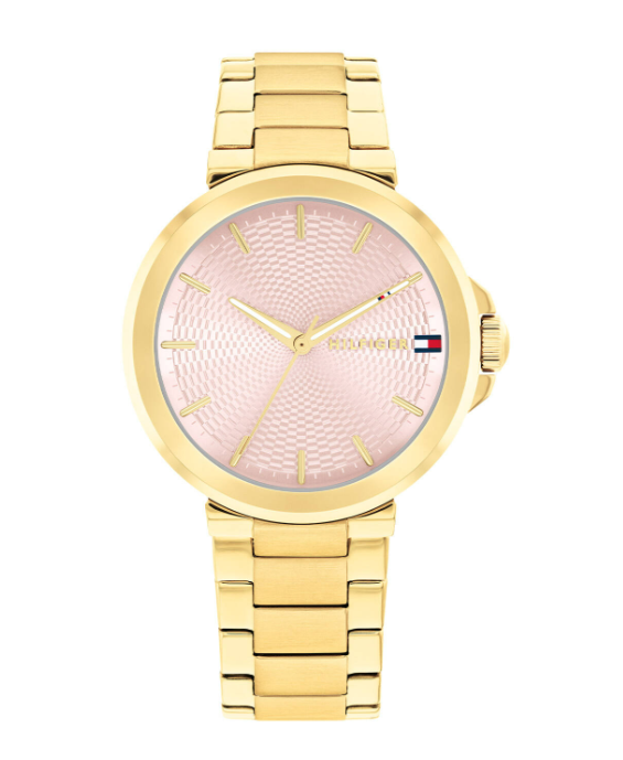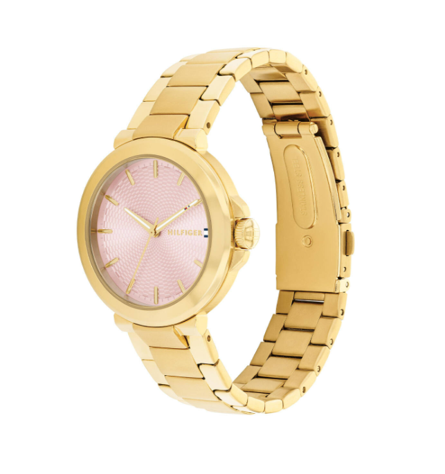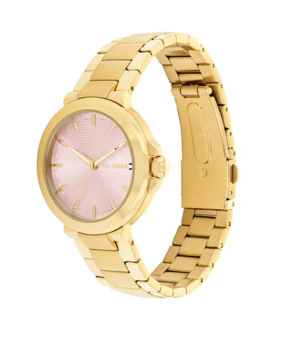 Dit horloge heeft een roze analoge wijzerplaat met een geelgoudkleurige kast (34 mm diameter) en is voorzien van mineraal glas. Het horloge is voorzien van een quartz (batterij) uurwerk en is 5 ATM/Bar (50m) waterdicht. Dit horloge komt uit de Lori serie. Het horloge heeft extra functies. Voor meer informatie over Tommy Hilfiger gaat u naar www.tommy.com.