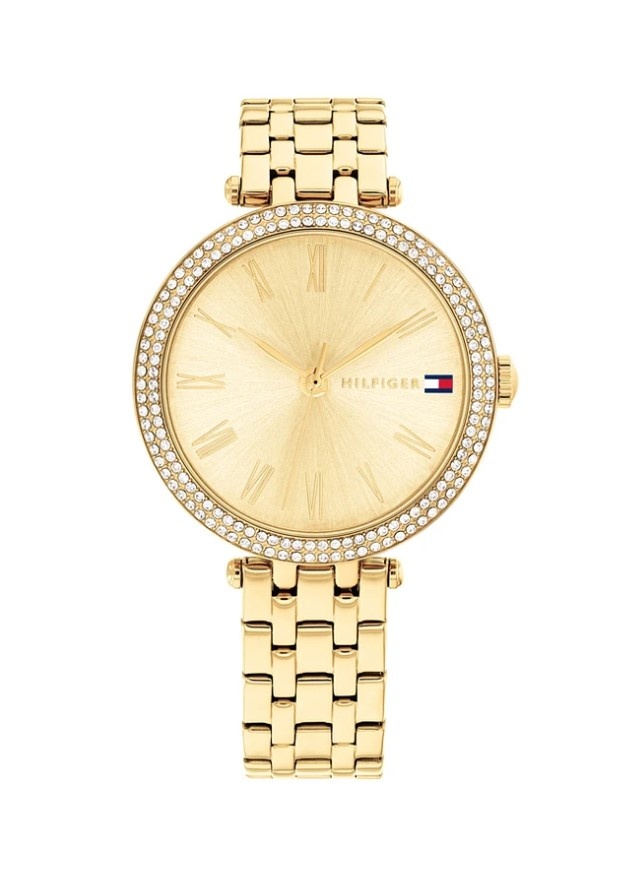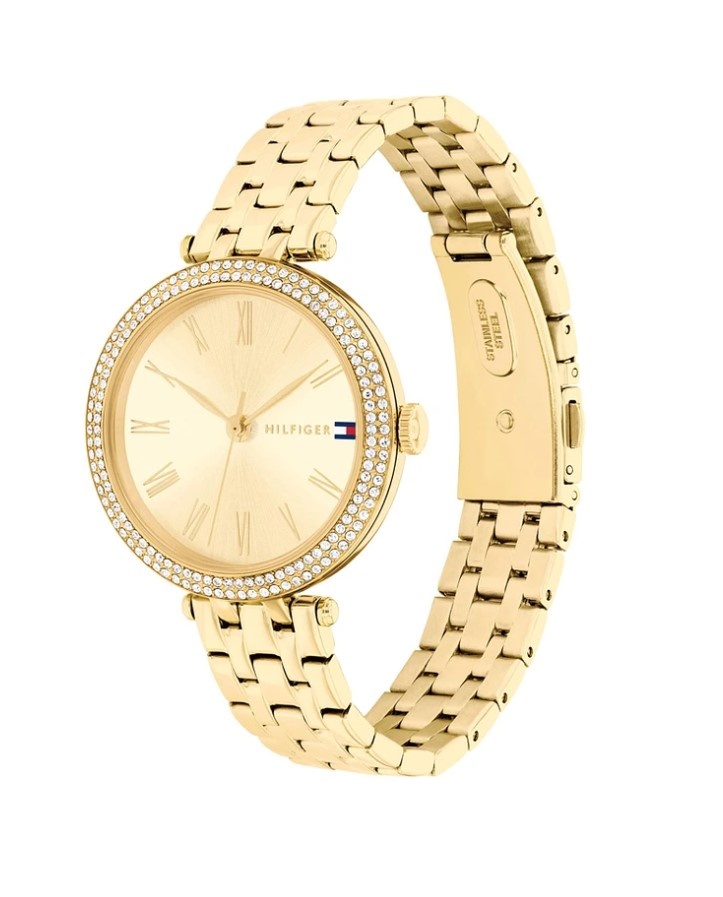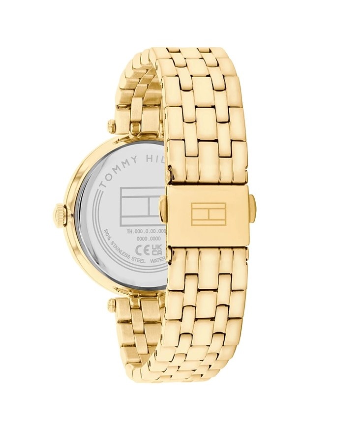 Dit horloge heeft een geelgoudkleurige analoge wijzerplaat met een geelgoudkleurige kast (34 mm diameter) en is voorzien van mineraalglas. Het horloge is voorzien van een quartz (batterij) uurwerk en is 3 ATM/Bar (30m) waterdicht. Dit horloge komt uit de Nathalie serie. Het horloge heeft geen extra functies. Voor meer informatie over Tommy Hilfiger gaat u naar www.tommy.com.