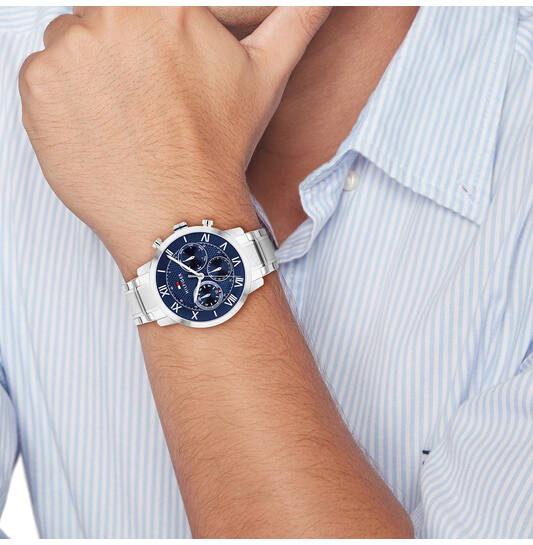 Dit horloge heeft een donkerblauwe analoge wijzerplaat met een zilverkleurige kast (42 mm diameter) en is voorzien van mineraal glas. Het horloge is voorzien van een quartz (batterij) uurwerk en is 5 ATM/Bar (50m) waterdicht. Dit horloge komt uit de Oxford serie. Het horloge heeft de volgende extra functies: datum-, dag- en 24-uursaanduiding. Voor meer informatie over Tommy Hilfiger gaat u naar www.tommy.com.