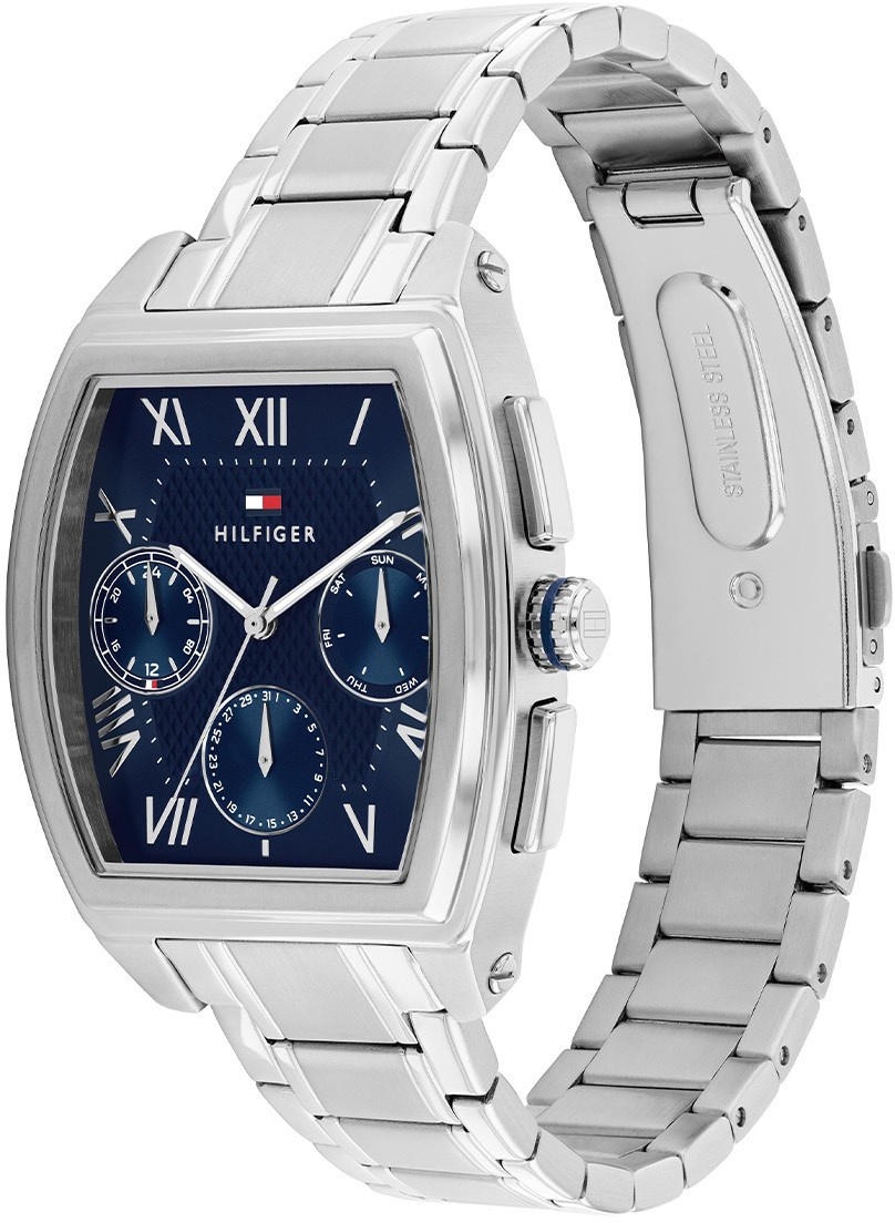 Dit horloge heeft een blauwe analoge wijzerplaat met een zilverkleurige kast (36 mm diameter) en is voorzien van mineraal glas. Het horloge is voorzien van een quartz (batterij) uurwerk en is 3 ATM/Bar (30m) waterdicht. Dit horloge komt uit de Oxford serie. Het horloge heeft de volgende functies: dag- en datumaanduiding, 24-uursaanduiding. Voor meer informatie over Tommy Hilfiger gaat u naar www.tommy.com.