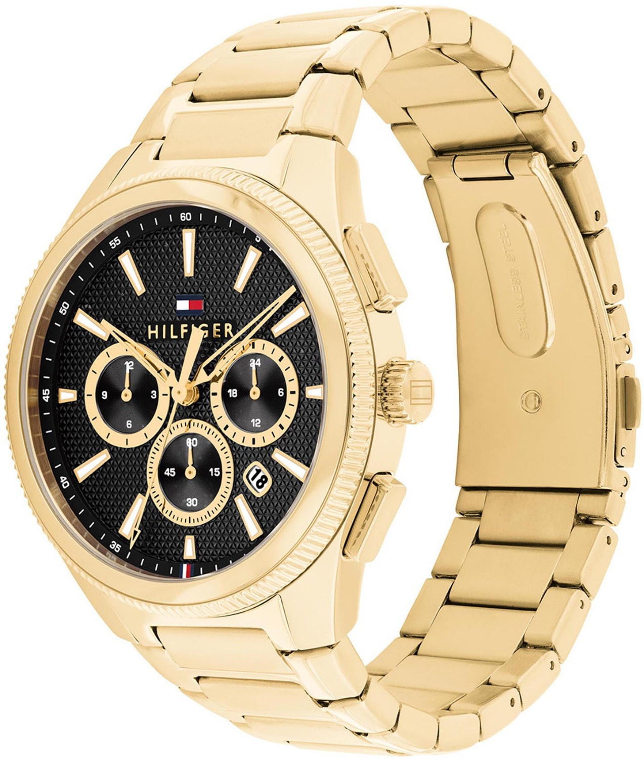 Dit horloge heeft een zwarte analoge wijzerplaat met een geelgoudkleurige kast (43 mm diameter) en is voorzien van mineraal glas. Het horloge is voorzien van een quartz (batterij) uurwerk en is 5 ATM/Bar (50m) waterdicht. Dit horloge komt uit de Sam serie. Het horloge heeft de volgende extra functies: chronograaf, datumaanduiding. Voor meer informatie over Tommy Hilfiger gaat u naar www.tommy.com.