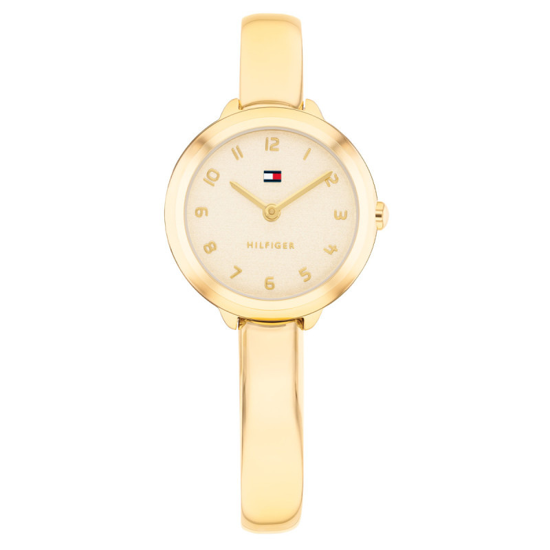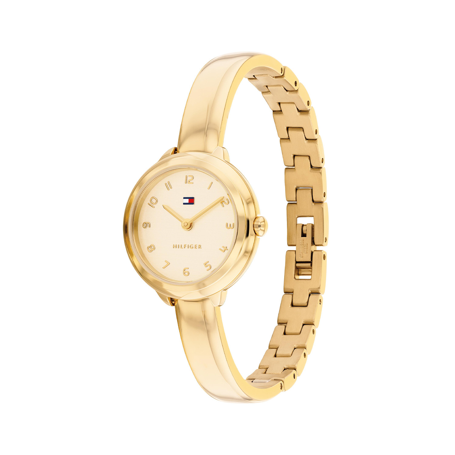 Dit horloge heeft een geelgoudkleurige analoge wijzerplaat met een geelgoudkleurige kast (26 mm diameter) en is voorzien van mineraalglas. Het horloge is voorzien van een quartz (batterij) uurwerk en is 3 ATM/Bar (30m) waterdicht. Het horloge heeft geen extra functies. Voor meer informatie over Tommy Hilfiger gaat u naar www.tommy.com.