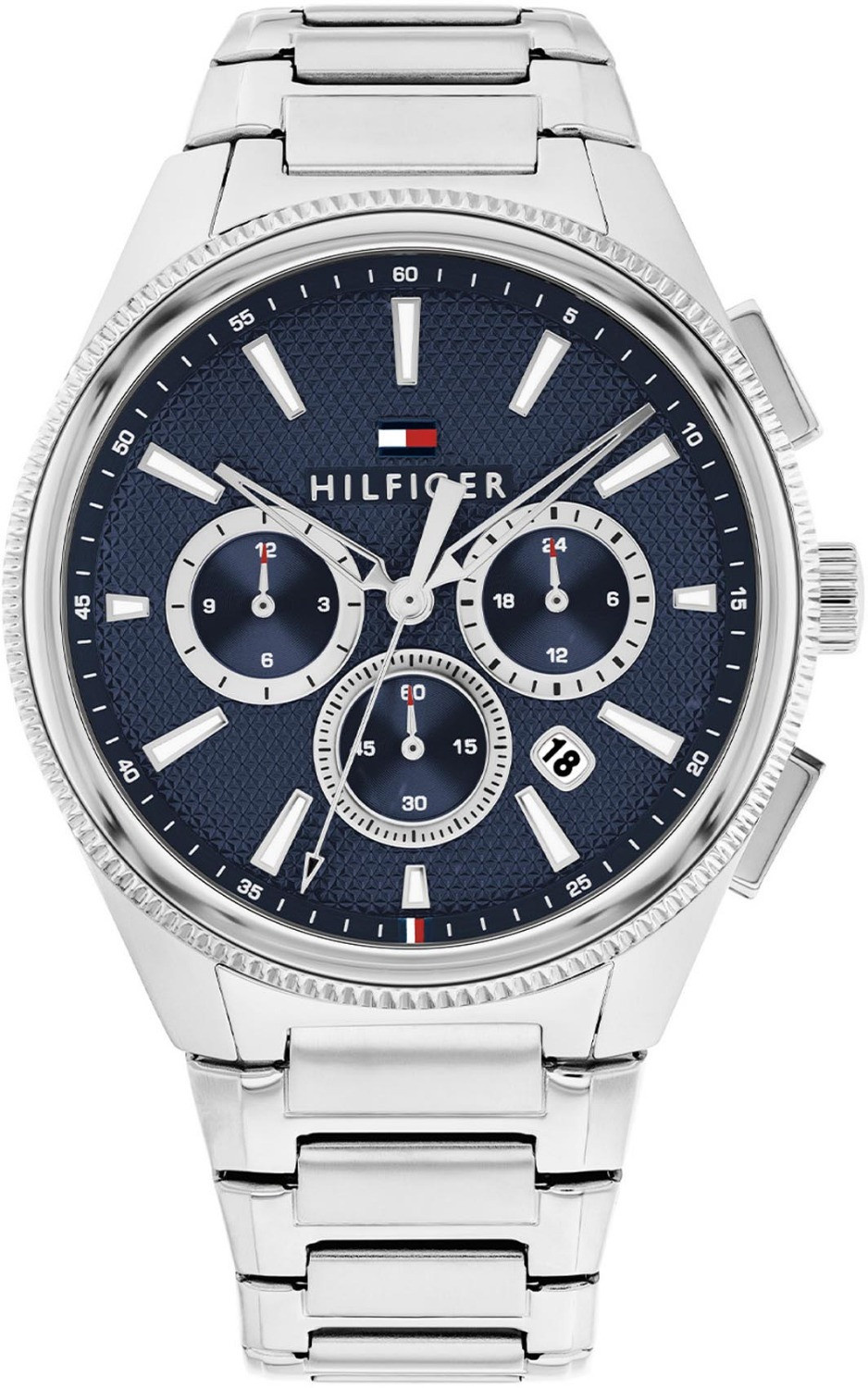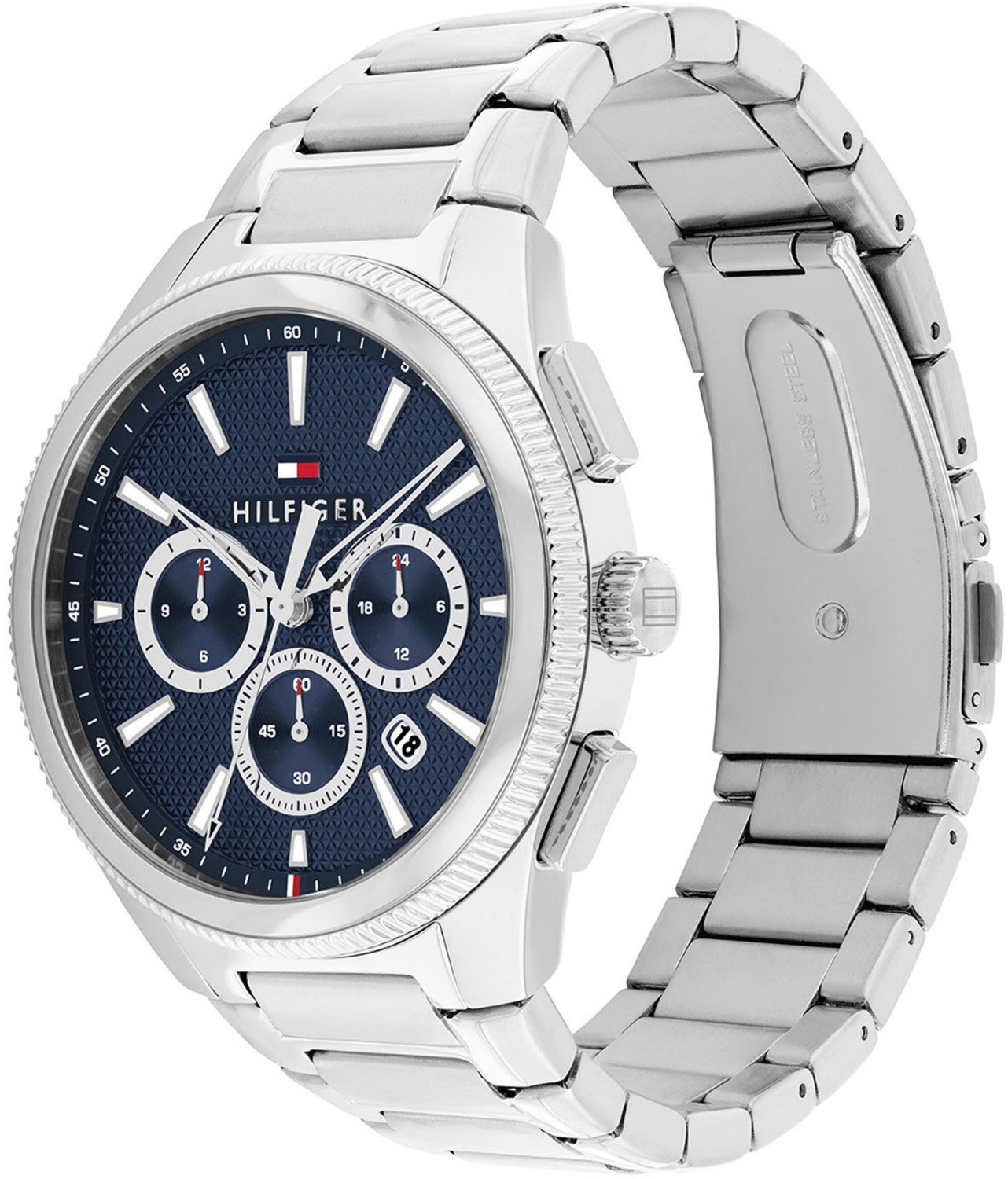 Dit horloge heeft een blauwe analoge wijzerplaat met een zilverkleurige kast (43 mm diameter) en is voorzien van mineraalglas. Het horloge is voorzien van een quartz (batterij) uurwerk en is 5 ATM/Bar (50m) waterdicht. Het horloge heeft de volgende extra functies: chronograaf, datumaanduiding. Voor meer informatie over Tommy Hilfiger gaat u naar www.tommy.com.