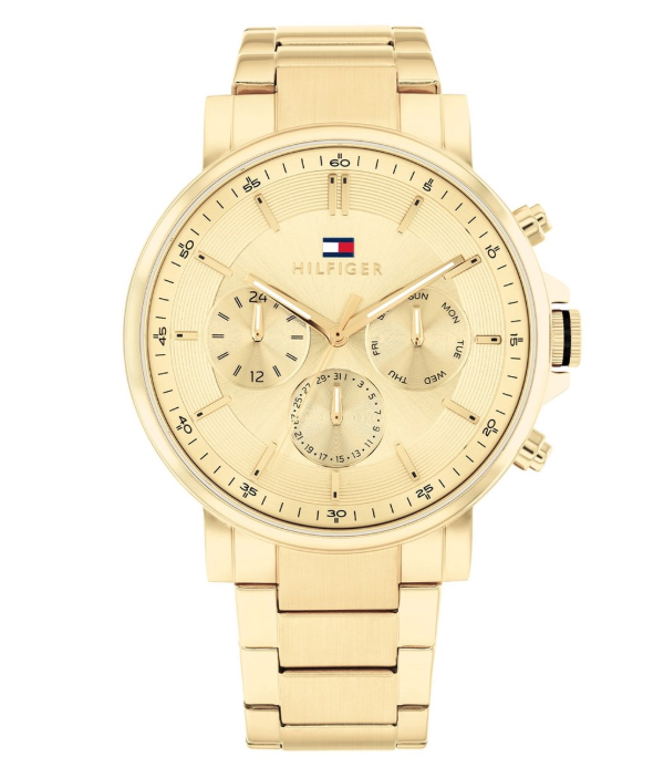 Dit horloge heeft een groene analoge wijzerplaat met een geelgoudkleurige kast (43 mm diameter) en is voorzien van mineraalglas. Het horloge is voorzien van een quartz (batterij) uurwerk en is 5 ATM/Bar (50m) waterdicht. Dit horloge komt uit de Tyler serie. Het horloge heeft de volgende extra functies: dag- datumfunctie, 24-uursaanduiding. Voor meer informatie over Tommy Hilfiger gaat u naar www.tommy.com.
