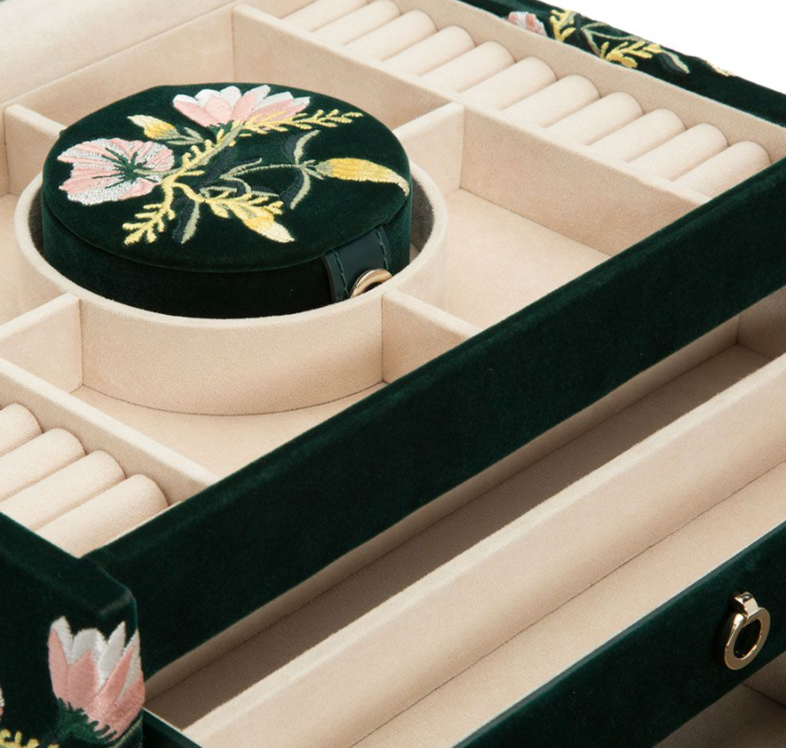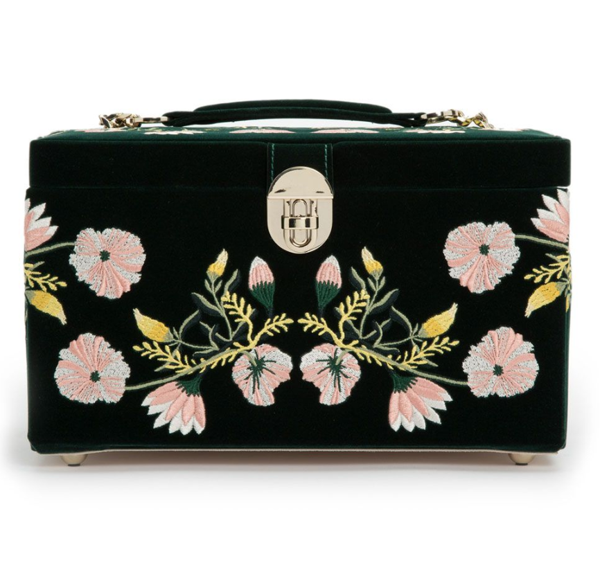 Deze in groen fluweel uitgevoerde sieraden box is met prachtige tulpen geborduurd. De Jewelry case gevoerd met LusterLoc™, een speciaal materiaal dat oxidatie van sieraden tegen gaat. Voor meer informatie over WOLF 1834 gaat u naar www.wolf1834.com